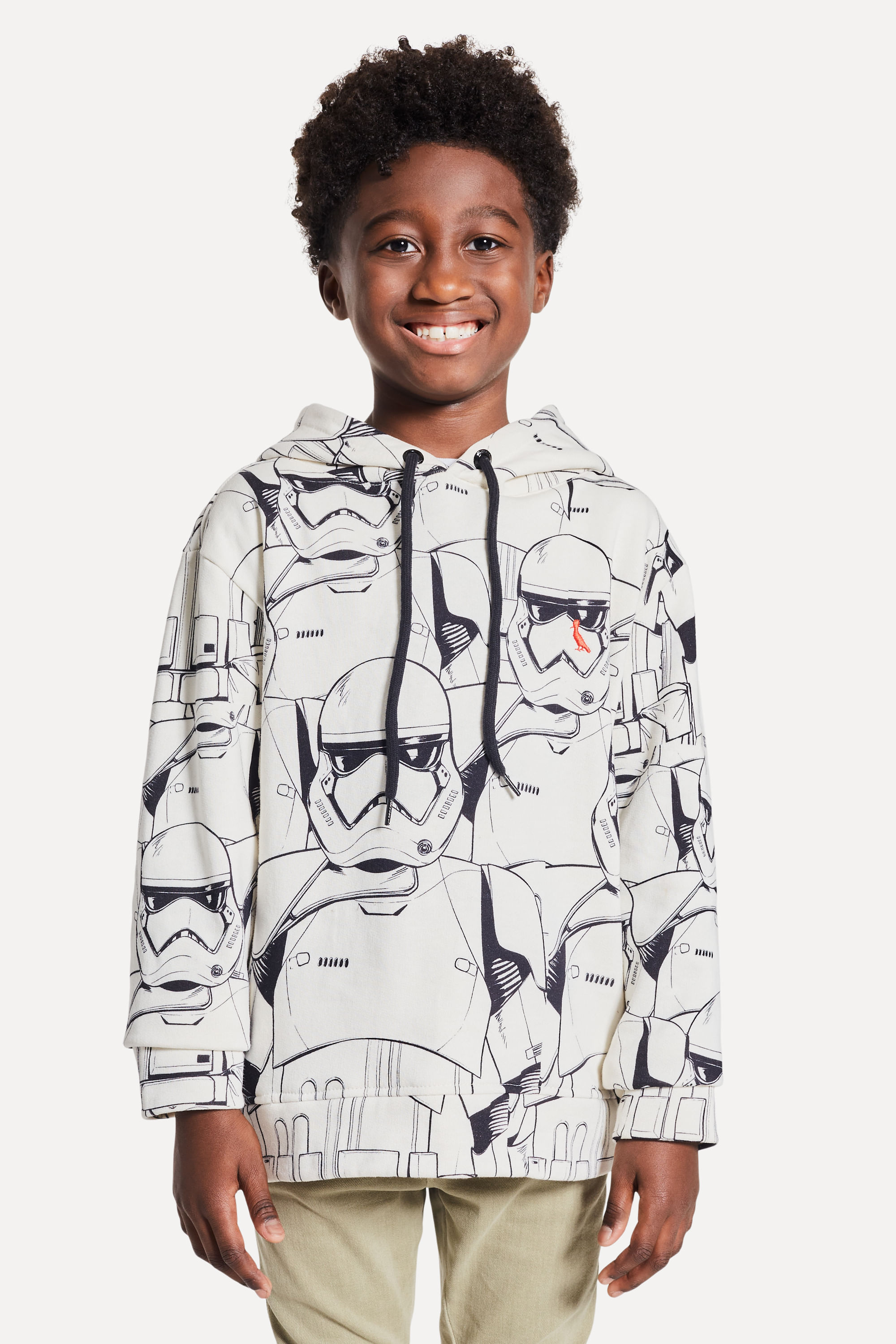 Que a força esteja com você! Conheça o Hoodie de Moletom Stormtrooper, perfeito para ser usada em um dia frio em uma galáxia distante! Feito 100% em algodão, possui manga longa, capuz duplo com ajuste em cadarço e saída por ilhós e bolsos embutidos laterais. Sua estampa traz um dos soldados do icônico exército Stormtrooper, acompanhado do nosso pica-pau vermelho bordado no peito. Pra diversão ficar completa, combine com calças e tênis. Comprando esta peça, você viabiliza cinco pratos de comida através do nosso Programa 1P5P. Casaco produzido eticamente no Brasil.