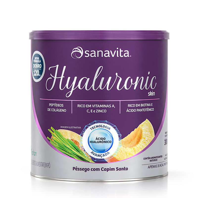 O Hyaluronic Skin sabor pêssego com capim santo, da Sanavita, é um suplemento alimentar desenvolvido com a mais avançada tecnologia para os cuidados com a pele.<br>Cada porção fornece peptídeos ativos de colágeno Peptan® e 120 mg de ácido hialurônico biodisponível com adição de biotina, ácido pantotênico e antioxidantes.<br>Sobre os ingredientes:<br>• Ácido hialurônico: componente importante para a estrutura da pele, é produzido naturalmente pelo organismo, porém essa produção é naturalmente reduzida com o avanço da idade.<br>• Peptídeos de colágeno Peptan®: apresenta baixo peso molecular e alta absorção. Obtido de fonte bovina, passa por um processo de hidrólise (quebra), facilitando a sua absorção e aproveitamento pelo organismo. Os aminoácidos presentes no colágeno compõem a estrutura de tecidos como a pele.<br>• Vitaminas A, C, E e o mineral zinco: apresentam ação antioxidante que auxilia na proteção dos danos causados pelos radicais livres.<br>• Vitamina C: auxilia na formação do colágeno.<br>• Vitamina A, biotina e zinco: contribuem para a manutenção da pele, cabelo e unhas.<br>Alérgicos:<br>Pode conter leite e soja.<br>Recomendação de consumo:<br>Em um copo vazio adicione 2 medidas rasas (9g) e em seguida, 200 mL de água ou bebida de sua preferência e mexa até completa dissolução.<br><br>Não utilize líquidos quentes ou bebidas muito ácidas. Para uma ótima diluição, utilize líquidos na temperatura ambiente e livres de gorduras, tais como leite desnatado. <br>Por que escolher este produto?<br>• Sem glúten<br>• Sem lactose<br>• Sem adição de açúcares<br>• Livre de conservantes, corantes ou aromas artificiais<br>• Baixo índice glicêmico<br>• Baixas calorias<br>Sobre a marca: <br>A Sanavita é uma das principais empresas produtoras de alimentos saudáveis do Brasil, especializada no desenvolvimento de alimentos funcionais e especiais. Graças a excelente qualidade de seus produtos e à sua origem científica, conquistou a fidelidade dos profissionais de saúde e dos consumidores em todo o país.
