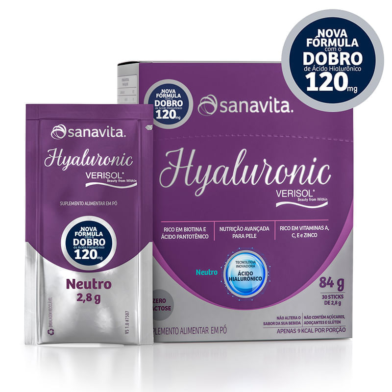 <p>O <strong>Hyaluronic Verisol </strong><strong>® sabor Neutro</strong>, da <strong>Sanavita</strong>, é um suplemento alimentar desenvolvido com a mais avançada tecnologia para os cuidados com a pele.</p> <p>Cada porção fornece <strong>2,5g de colágeno</strong> <strong>Verisol</strong><strong>®</strong> e <strong>120 mg de</strong> <strong>ácido hialurônico</strong> <strong>biodisponível</strong> com adição de biotina, ácido pantotênico e antioxidantes.</p> Sobre os ingredientes: <p><strong>Peptídeos de colágeno Verisol</strong><strong>®:</strong> obtido por meio de tecnologia Alemã, que utiliza um processo exclusivo e patenteado, resultando em uma composição única de peptídeos específicos de baixo peso molecular. Os aminoácidos presentes no colágeno compõem a estrutura de tecidos como a pele.</p> <p><strong>Ácido hialurônico: </strong>componente importante para a estrutura da pele, é produzido naturalmente pelo organismo, porém essa produção é naturalmente reduzida com o avanço da idade.</p> <p><strong>Vitaminas A, C, E e o mineral zinco:</strong> apresentam <strong>ação antioxidante</strong> que auxilia na proteção dos danos causados pelos radicais livres.</p> <p><strong>Vitamina C: </strong>auxilia na formação do colágeno.</p> <p><strong>Vitamina A, biotina e zinco:</strong> contribuem para a manutenção da pele, cabelo e unhas.</p> <p><strong>Alergênicos: </strong>Pode conter leite e soja.</p> Sugestão de consumo: <p>Em um copo vazio adicione 1 stick (2,8 g) e em seguida, 200 mL de água ou bebida de sua preferência e mexa até completa dissolução.</p> <p>Não utilize líquidos quentes ou bebidas muito ácidas. Para uma ótima diluição, utilize líquidos na temperatura ambiente e livres de gorduras, tais como leite desnatado.</p> Motivos para escolher o produto: <ul> <li>Sem glúten</li> <li>Sem lactose</li> <li>Livre de conservantes, corantes ou aromas artificiais</li> <li>Baixo índice glicêmico</li> <li>Low carb</li> <li>Não contém adoçantes</li> </ul> Sobre a marca: <p>A Sanavita é uma das principais empresas produtoras de alimentos saudáveis do Brasil, especializada no desenvolvimento de alimentos funcionais e especiais. Graças a excelente qualidade de seus produtos e à sua origem científica, conquistou a fidelidade dos profissionais de saúde e dos consumidores em todo o país.</p>