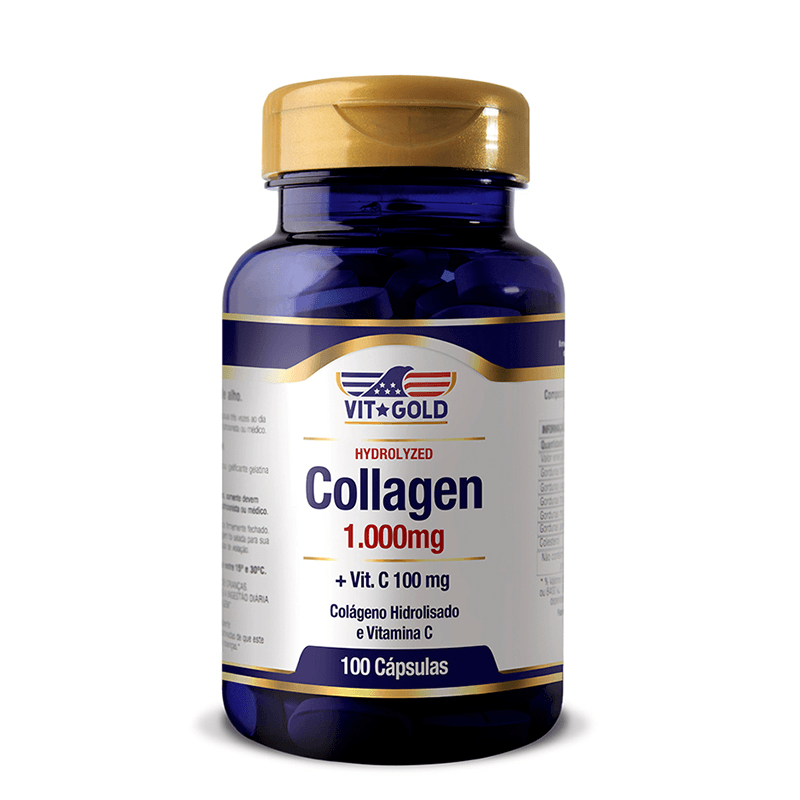 <p>O <strong>Hydrolyzed Collagen Vit C 1000mg com 100 cápsulas</strong>, serve para complementar o organismo com colágeno, antioxidantes e vitaminas, colaborando assim para a saúde da pele, unhas, cabelos e articulações.</p> Sobre os ingredientes: <p>Colágeno hidrolizado, ácido ascórbico (vitamina c), gelificante gelatina, fosfato dicálcico, estearato de magnésio. Não contém Glúten.</p> Sugestão de consumo: <p>Sugere-se 2 comprimidos ao dia, durante a refeição principal.</p> Motivos para escolher o produto: <ul> <li> <p>Colágeno</p> </li> <li> <p>Antioxidantes</p> </li> <li> <p>Vitamina C</p> </li> </ul> Sobre a marca: <p>A <strong>VitGold</strong>‚ é uma empresa de suplementos vitamínicos e minerais dos Estados Unidos, com atividades no Brasil desde 1994. Seus produtos são produzidos em laboratórios credenciados e validados por órgãos como a FDA nos Estados Unidos e a ANVISA no Brasil, garantindo a qualidade dos suplementos.</p>
