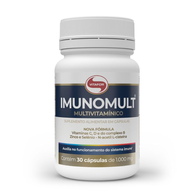 <h2><strong>Imunomult Multivitaminico 1000Mg 30Caps Vitafor</strong></h2> <h2>O <strong>Imunomult </strong>da <strong>Vitafor</strong> é um suplemento multivitamínico composto pelas vitaminas A, B6, B12 e ácido fólico e os minerais zinco e selênio, ideais para contribuir com o reforço do sistema imunológico, além de outros nutrientes indispensáveis para a manutenção da saúde. Vem nessa embalagem com 30 cápsulas.</h2> <h2><strong>Sobre os ingredientes:</strong></h2> <h2>Não contém glúten</h2> <h2><strong> </strong></h2> <h2><strong>Sugestão de consumo:</strong></h2> <h2>Recomenda-se a ingestão de 2 cápsulas ao dia ou conforme recomendação de um profissional de saúde.</h2> <h2><strong>Motivos para escolher o produto:</strong></h2> <ul> <li> <h2>Ideal para o sistema imunológico;</h2> </li> <li> <h2>Sem glúten;</h2> </li> <li> <h2>Sem adição de açúcar;</h2> </li> <li> <h2>Prático para consumo no formato de cápsulas.</h2> </li> </ul> <h2> </h2> <h2><strong>A Marca</strong></h2> <h2>A<strong> Vitafor</strong> é uma empresa que tem como missão produzir suplementos nutricionais para a promoção da saúde. Em seu portifólio há mais de 200 produtos que atendem desde a infância até a melhor idade, todos produzidos em laboratório próprio, com garantia de qualidade e eficácia.</h2>