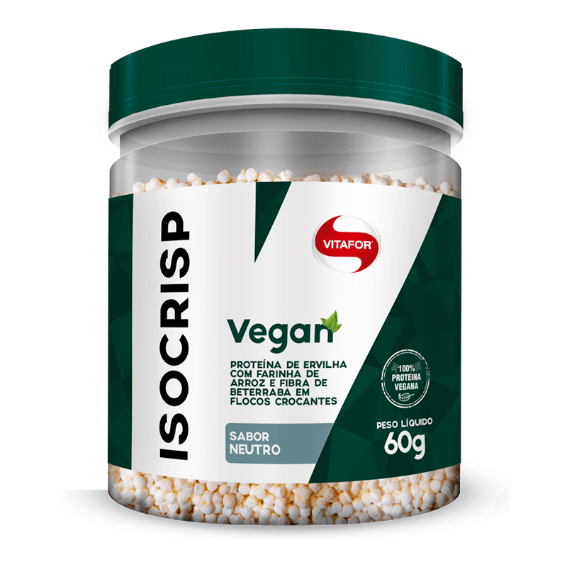 Informações técnicas do produto:<br> O Isocrisp Vegan, 60g, Vitafor, é um produto que pode ser consumido com qualquer alimento, possui 15 gramas de proteína por porção, e é fonte de fibra de beterraba e fibra prebiótica, sendo ideal para o equilibro de macronutrientes em dietas veganas. Livre de corantes artificiais e zero lactose.<br> <br> Recomendação de consumo:<br> Acrescente 30g de ISOCRISP VEGAN (uma colher medida) ao alimento de sua preferência. Pode ser consumido juntamente com alimentos doces e salgados.<br> <br> Por que escolher esse produto?<br> Sabor neutro<br> Versatilidade para diversas preparações: doces e salgadas<br> Com fibra de beterraba<br> Suplemento proteico ideal para equilíbrio de macronutrientes em dietas veganas e vegetarianas<br> Crisp mastigável que auxilia na saciedade<br> Proteínas que contribuem na manutenção de massa magra<br> Fonte de fibra prebiótica<br> Zero Lactose<br> Livre de Corantes Artificias<br> Zero Glúten