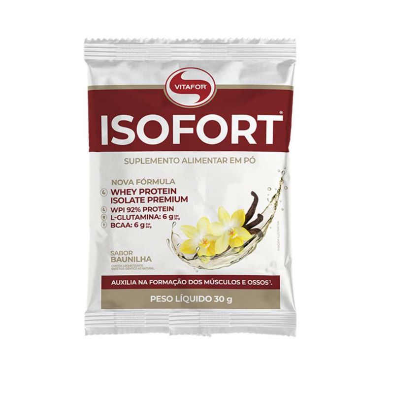 <p>"Isofort Baunilha, da Vitafor é um suplemento em pó à base de proteína isolada do soro do leite (Whey protein isolada) não desnaturadas e parcialmente hidrolisadas, produzidas por um processo de extração de alta tecnologia.</p> <p> </p> <p>Sobre o ingrediente:</p> <p> </p> <p>Whey protein isolado: fonte natural de BCAA (leucina, valina e isoleucina), é facilmente absorvida pelo organismo. Pode ser utilizada por praticantes de qualquer modalidade esportiva, desde Fisioculturismo até esportes de resistência (como ciclismo, triatlon e maratonas).</p> <p> </p> <p>Recomendação de consumo:</p> <p> </p> <p>Dissolva 30g (1 sachê) de Isofort em 300ml de líquido gelado (água, leite de soja ou suco) e consuma preferencialmente, depois do treino.</p> <p> </p> <p>Por que escolher este produto?</p> <p>92% de proteína</p> <p>100% Whey protein isolado</p> <p>Fornece 27g de proteínas</p> <p>Com cacau</p> <p>Sobre a Marca:</p> <p> </p> <p>Vitafor é uma marca brasileira de suplementos alimentares com padrão de alta qualidade e eficácia, que valoriza o desenvolvimento sustentável, incorporando esse conceito a suas operações diárias. Os resíduos da fabricação dos produtos são mínimos, as embalagens utilizadas em todo o processo são recicladas e seus produtos são atóxicos, beneficiando a sua saúde e cuidando da natureza e do meio ambiente em parceria com a comunidade. A marca possui rigorosa análise e comprovação de testes de todos os lotes de seus produtos.</p>