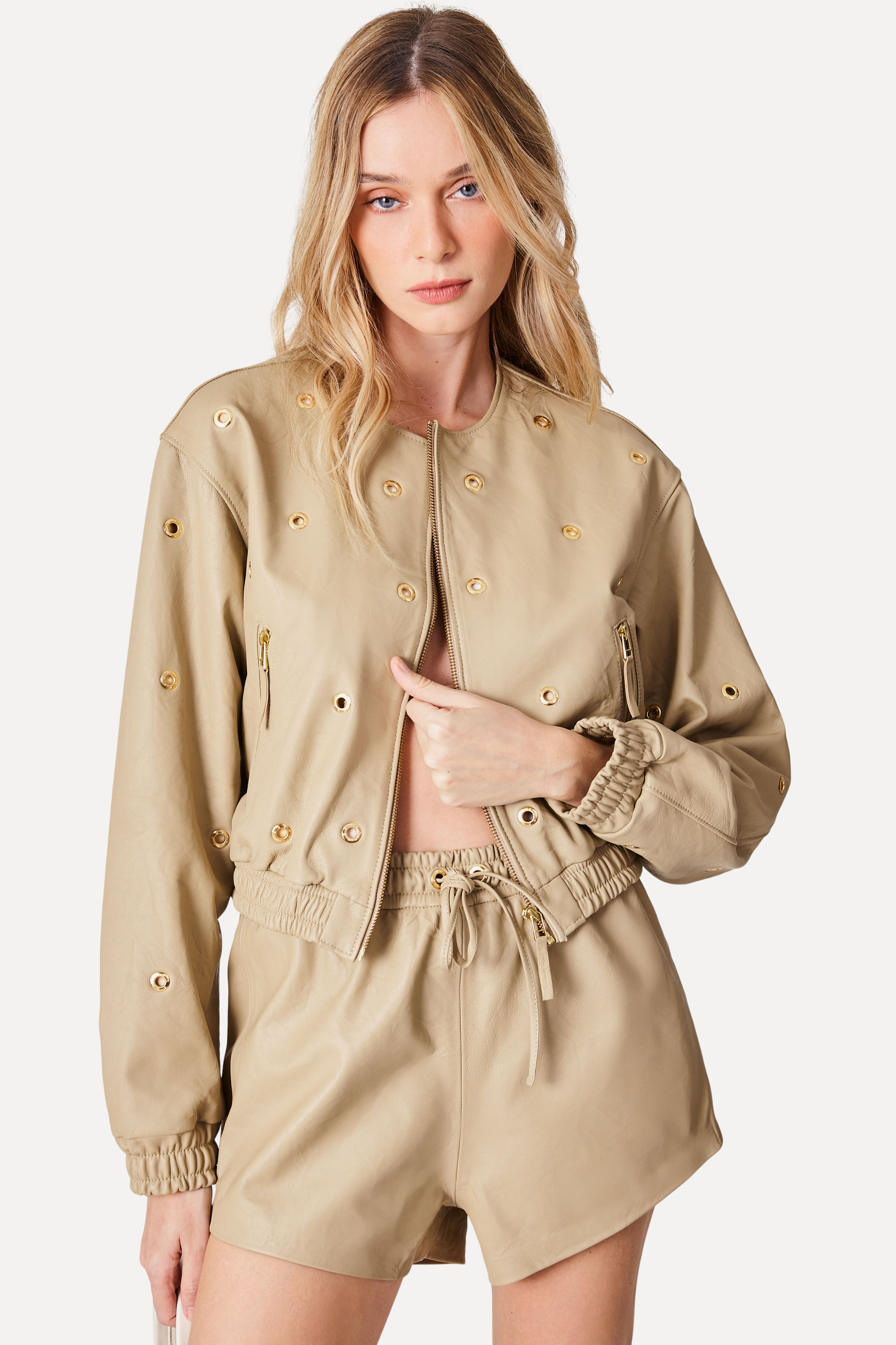 Procurando uma jaqueta de couro diferente das demais? Então conheça a Jaqueta Couro Ilhos! Feita 100% em couro, ela possui manga longa, elástico na cintura e nos punhos e fechamento por zíper frontal e nos bolsos. Seu chame fica por conta dos ilhós espalhados por toda a peça, trazendo um chame único. Combine com o Short Couro Ilhos e tenha um look completo! A modelo tem 1,76 de altura, 85 de busto e veste 36. Comprando esta peça, você viabiliza cinco pratos de comida através do nosso Programa 1P5P. Jaqueta produzida eticamente no Brasil.