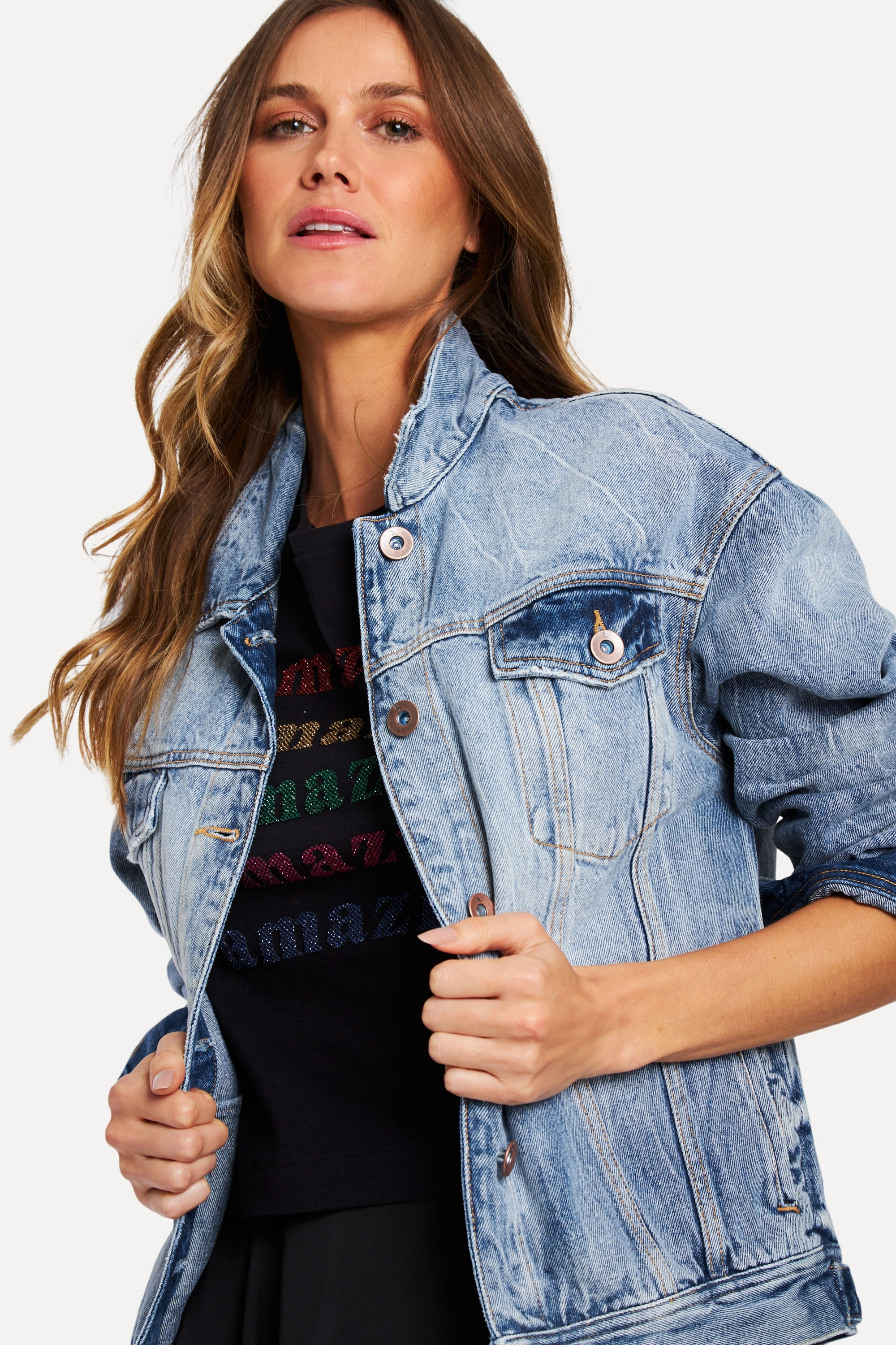 Favoritos da estação! A jaqueta jeans índigo tem modelagem clássica e lavagem média. Perfeita para compor looks urbanos e causais, ela vai bem sobreposta à camisetas e vestidos.