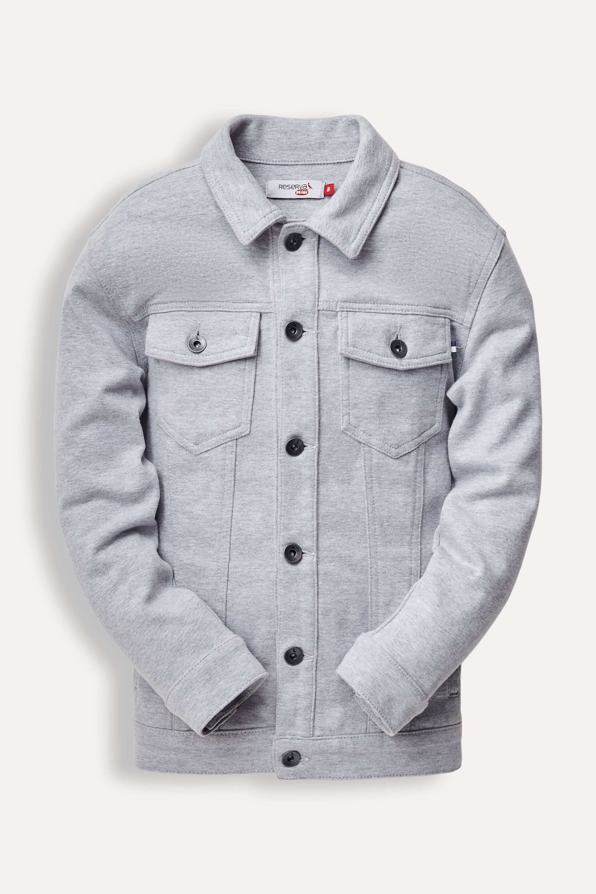 Jaqueta infantil com modelagem e acabamentos de uma jaqueta jeans clássica, porém na malha ponto roma, que é uma malha de elasticidade bidirecional, estruturada e com uma leve textura. Possui botões de metal na frente, no punho e nos bolsos, assinada com etiqueta tricolor no bolso e bordado de pica pau nas costas. Forro interno da jaqueta tem um acabamento que pode ser usado como bolso. Produzido eticamente no Brasil. Comprando esta peça, você complementa cinco pratos de comida através do nosso programa 1P=5P.