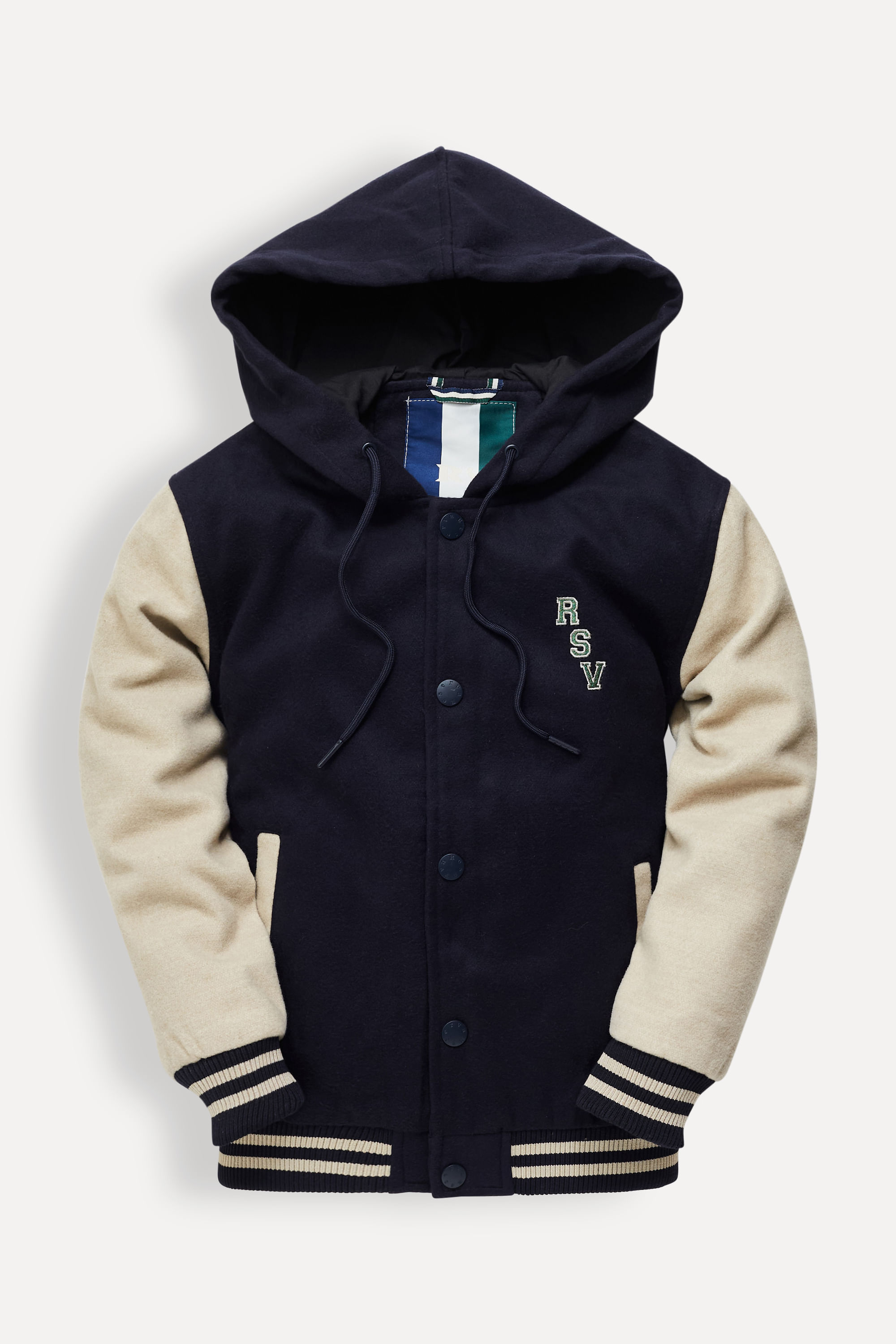 Jaqueta bomber estilo college com capuz e bolsos embutidos na frente. Leva um patch RSV em chenille no busto, outro patch R grande em chenille nas costas e retilíneas listradas nos punhos e barra. Comprando esta peça, você complementa cinco pratos de comida através do nosso programa 1P=5P.