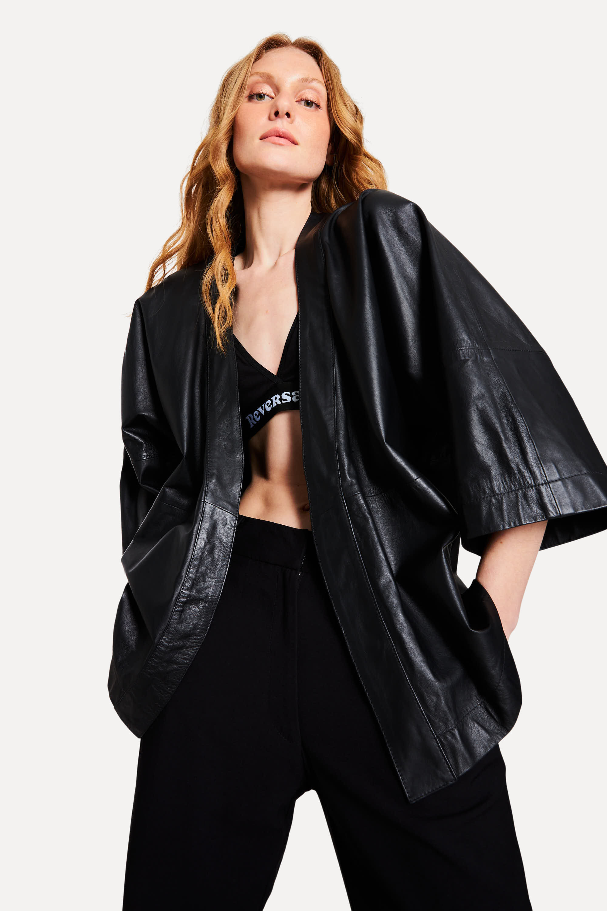 O Kimono Couro ideal para ocasiões que pedem um look mais moderno. Perfeito para usar como sobreposição com camisetas ou tops. Kimono Feminino Reversa produzido eticamente no Brasil. Comprando esta peça, você viabiliza cinco pratos de comida através do nosso programa 1P5P. A modelo mede 1,77 m e 74 cm de busto.