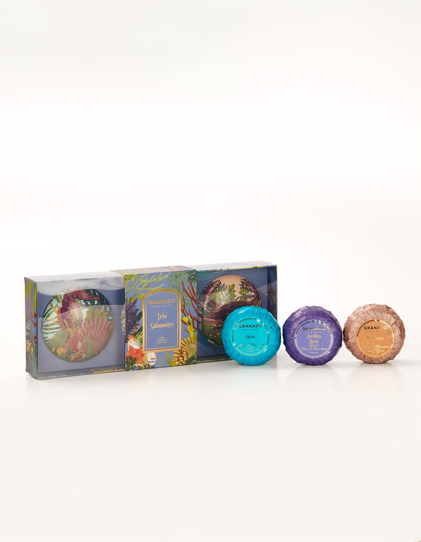 A Granado convida você a embarcar em uma jornada única e envolvente nas maravilhas do fundo do mar. Inspirada na riqueza e diversidade das espécies marinhas, a coleção Fundo do Mar mergulha no universo da perfumaria para representar toda a exuberância da extensa costa litorânea – banhada pelo oceano atlântico de norte a sul do país. O kit Trio Sabonetes apresenta três sabonetes em barra nas fragrâncias Oásis, Jardim Real e Esplendor. Além disso, acompanha três bolas de Natal estampadas para decorar sua árvore de Natal!Os sabonetes cremosos da Granado possuem ingredientes de origem natural e são formulados com base vegetal, glicerina vegetal, manteiga de murumuru e óleo de coco, ativos que auxiliam na hidratação da pele. Além disso, ele limpa suavemente, promove maciez à pele e deixa perfumada por mais tempo. Na embalagem, as bolas de Natal seguem a identidade visual da coleção Fundo do Mar, que foi utilizada a técnica de colagem Vintage juntamente com ilustrações digitais. A caixa possui uma diversidade de espécies marinhas, unindo o frescor do mar e o calor tropical. Não possui parabenos e corantes nas formulações. Produtos não testados em animais. Livres de ingredientes de origem animal. Conteúdo: 3 sabonetes em barra 150g e 3 bolas de Natal estampadas.