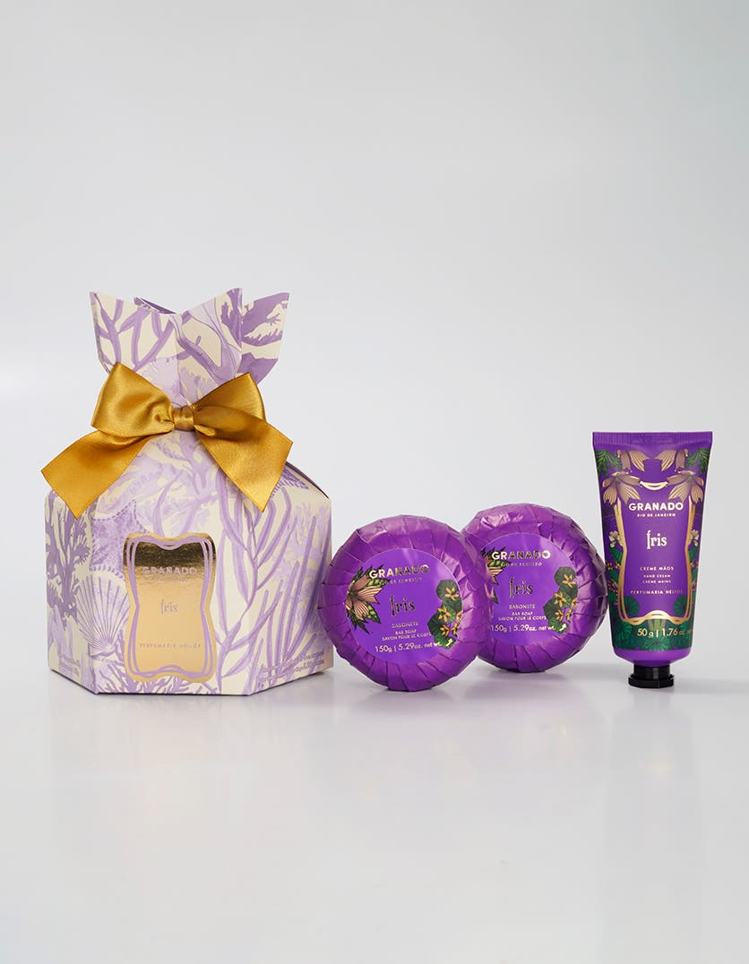 A Granado convida você a embarcar em uma jornada única e envolvente nas maravilhas do fundo do mar. Inspirada na riqueza e diversidade marinha, a coleção Elixir também mergulha no universo da perfumaria para representar toda a exuberância da extensa costa litorânea com a pluralidade de corais e conchas. A fragrância explora a íris como protagonista em sua construção. A floralidade é envelopada com notas de âmbar e cedro, sendo uma criação fresca, leve e contemporânea. Ideal para o dia a dia e perfeita para combinar com outras fragrâncias para trazer conforto e delicadeza.O Kit Bombom combina um creme mãos e dois sabonetes em barra, perfeito para gerar experimentação da fragrância em outras categorias! Kit Bombom e suas propriedades Com 76% de ingredientes de origem natural, o sabonete em barra cremoso é formulado com glicerina vegetal, manteiga de murumuru e óleo de coco, ativos que auxiliam na hidratação da pele. Além disso, ele limpa suavemente, promove maciez à pele e deixa perfumada por mais tempo.O creme para mãos, com 92% de ingredientes de origem natural, é formulado com óleo de amêndoa doce, semente de uva e açaí, que hidratam, nutrem deixam as mãos macias e sedosas. De acordo com o estudo ""Avaliação da hidratação da pele por cronometria"", realizado pelo Instituto de Pesquisa Clínica Integrada Ltda, este produto fornece hidratação prolongada.Em formato de bombom, o hot stamping dourado traz sofisticação e cores monocromáticas em uma composição que mistura corais e conchas de maneira elegante. Não possui parabenos e corantes nas formulações. Produtos não testados em animais. Livres de ingredientes de origem animal. Conteúdo: 2 sabonetes em barra 150g + 1 creme mãos 50g.