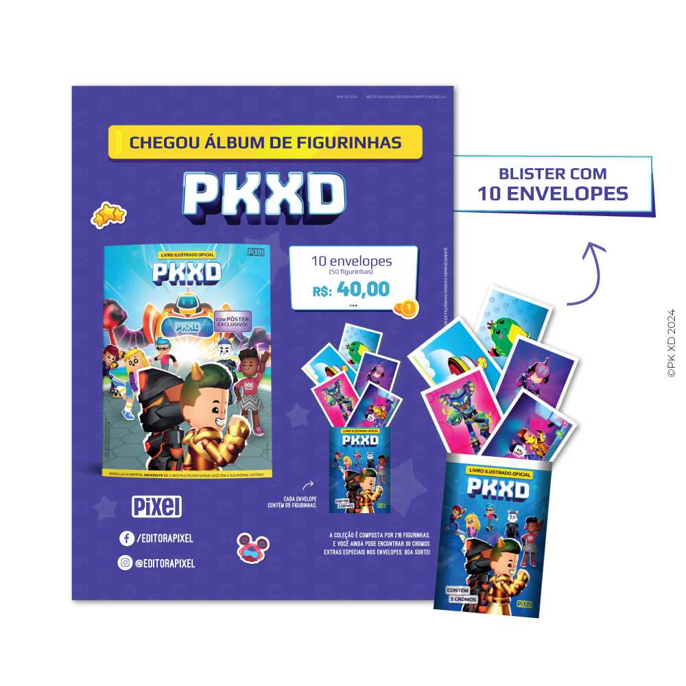 Kit com 50 figurinhas do Livro ilustrado oficial PK XD, sendo 10 envelopes com 5 figurinhas cada. Não acompanha álbum. PK XD é um jogo que conquistou fãs ao redor do mundo, chegando à marca de 50 milhões de jogadores ativos. No estilo sandbox, ou “caixa de areia”, o jogo é recheado de diversão e aventura, e quem escolhe o desafio ou atividade é você: desde ajudar a salvar a cidade de PK XD, até passar o dia cuidando de seu pet na escola ou aperfeiçoando seu look. Além de vários minigames e eventos temáticos para participar com amigos, o jogo oferece diversos itens, figurinhas, armaduras e looks para colecionar. Isso sem falar nos pets: um mais fofo que o outro! O Livro Ilustrado Oficial PK XD reúne tudo isso e muito mais! Ricamente ilustrado, ele foi pensado para que o fã possa guardar com carinho tudo aquilo que há de mais memorável no jogo! Comece já a sua coleção! Imagens ilustrativas. Figurinhas sortidas nos envelopes.