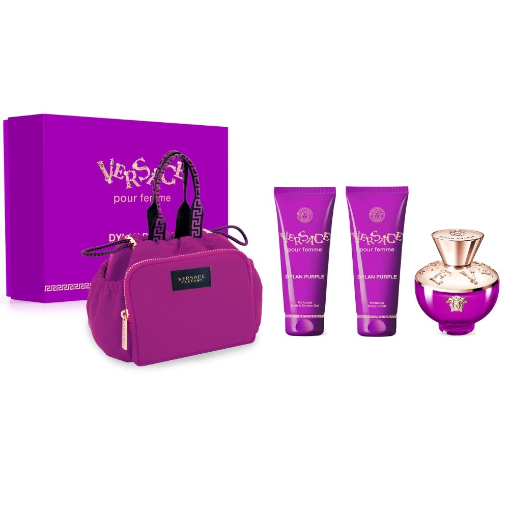 O coffret contém:<br /> <br /> - Versace Dylan Purple EDP 100 ml.<br /> <br /> - Versace Dylan Purple Shower Gel 100 ml.<br /> <br /> - Versace Dylan Purple Body Lotion 100 ml.<br /> <br /> - Versace Pink Bag.