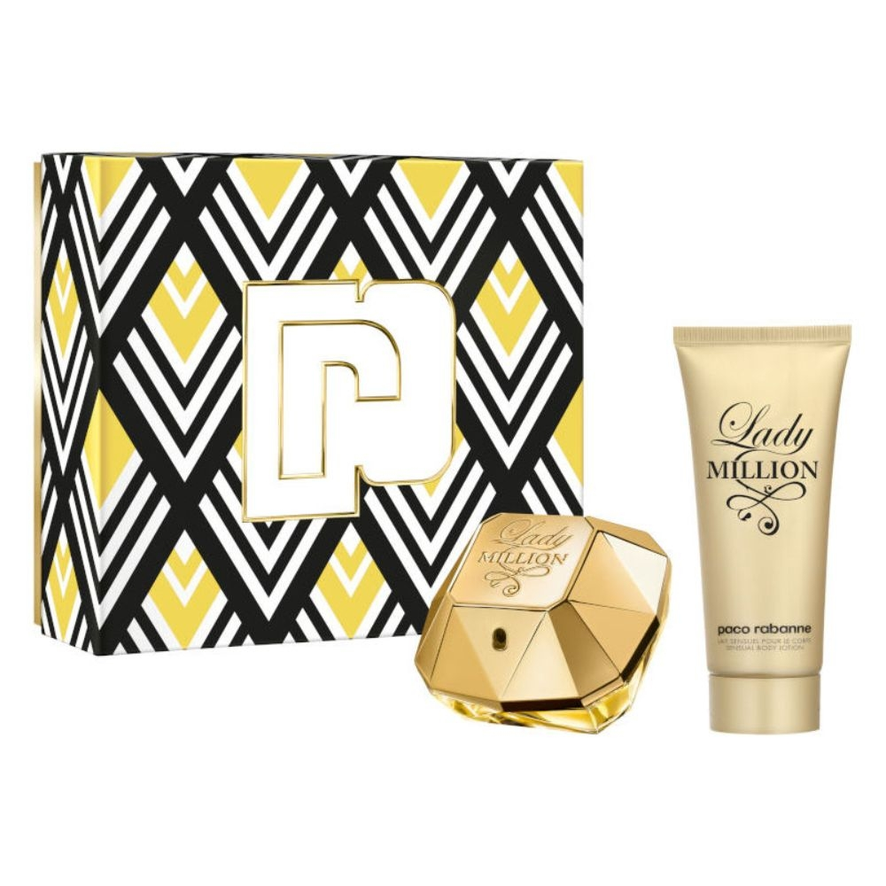 O Lady Million Eau de Parfum é uma fragrância sofisticada e envolvente, que combina notas florais, frutadas e amadeiradas. Suas notas de topo trazem um aroma refrescante de framboesa e néroli, seguidas por um coração floral composto de flor de laranjeira e jasmim. Nas notas de base, encontramos um toque de patchouli e mel, que adicionam uma sensualidade e profundidade irresistíveis.<br /> <br /> A loção corporal sensual complementa a experiência, oferecendo hidratação e um toque suave à pele. Sua fórmula nutritiva e delicada deixa a pele macia, sedosa e levemente perfumada com a fragrância viciante do Lady Million.<br /> <br /> Com o Kit Lady Million Feminino Eau de Parfum Paco Rabanne, você poderá se sentir poderosa, elegante e envolvente em todas as ocasiões. Deixe sua marca onde quer que vá, com essa combinação exclusiva de perfume e loção corporal.