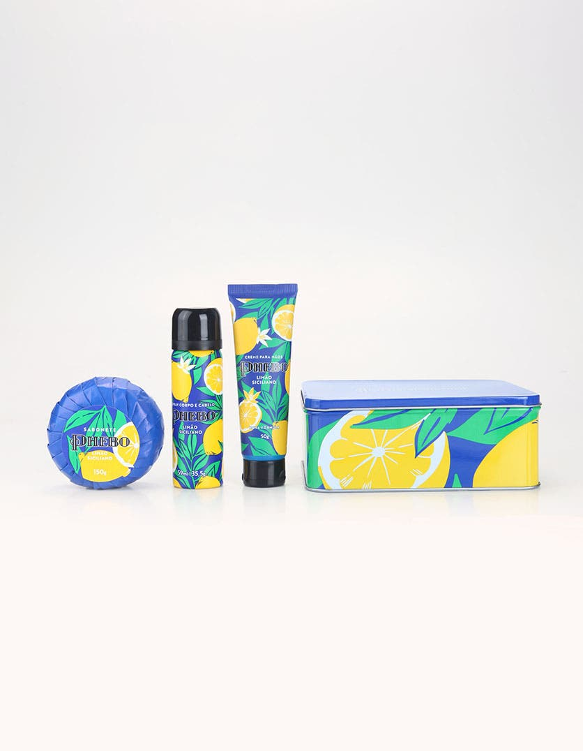 Limão Siciliano é uma das fragrâncias mais queridas da Phebo e conquista pelo seu cítrico suave e frescor. Inspirado nas agradáveis tardes de sol da costa do Mediterrâneo, é ensolarado, vibrante e confortável. Ideal para presentear, o Kit Lata Perfumada traz um conjunto completo para uma perfumação diária, com sabonete cremoso em barra, creme para as mãos e spray para corpo e cabelo.O sabonete em barra cremoso tem 77% de ingredientes de origem natural e é formulado com base vegetal e enriquecido com manteiga de murumuru e óleo de coco, que auxiliam a hidratação, nutrição e proteção da pele.O creme para mãos é formulado com Vitamina E e óleos naturais de amêndoa doce, semente de uva e açaí, ideais para proteger e hidratar a pele, deixando-a macia e sedosa. E o Spray para corpo e cabelo pode ser usado como um body splash, reaplicando sempre que quiser – além de ter o tamanho ideal para levar na bolsa ou no nécessaire.A embalagem da lata segue a identidade visual da linha Origens, assinada pelo ilustrador Gabriel Azevedo. Os produtos são formulados sem a adição de parabenos ou corantes.Produtos veganos.Não testados em animais.Conteúdo: 1 creme para mãos 50g, 1 sabonetes em barra 50g e 1 spray para corpo e cabelo.