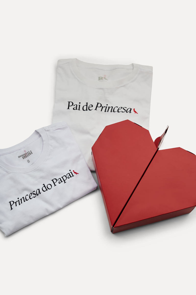 O Kit Pai de princesa bebê perfeito pra presentear pais e Minis! Nele, vem com 2 camiseta brancas, de manga curta e gola redonda, uma com os dizeres “Pai de princesa” e outra infantil “Princesa do papai”. Esse kit vem em uma embalagem em formato de coração, perfeito para tornar esse presente ainda mais especial! Comprando esta peça, você viabiliza cinco pratos de comida através do nosso Programa 1P5P. Kit produzido eticamente no Brasil.