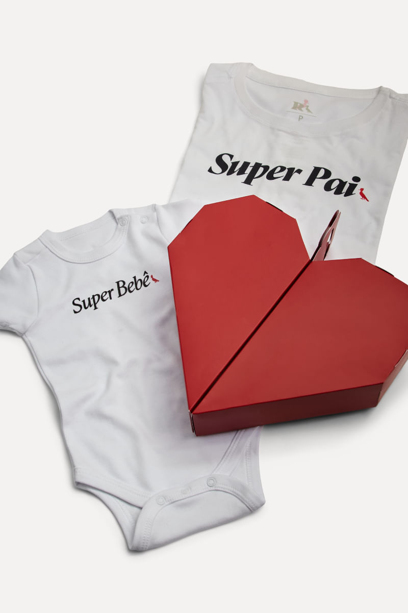 O Kit Super Pai E Super Bebê é perfeito pra presentear pais e seus novos Minis! Nele, vem 1 camiseta branca, de manga curta e gola redonda, e 1 body de manga curta e com botões de pressão na parte de baixo, com os dizeres “Super Pai” e “Super Bebê”. Esse kit vem em uma embalagem em formato de coração, perfeito para tornar esse presente ainda mais especial! Comprando esta peça, você viabiliza cinco pratos de comida através do nosso Programa 1P5P. Kit produzido eticamente no Brasil.