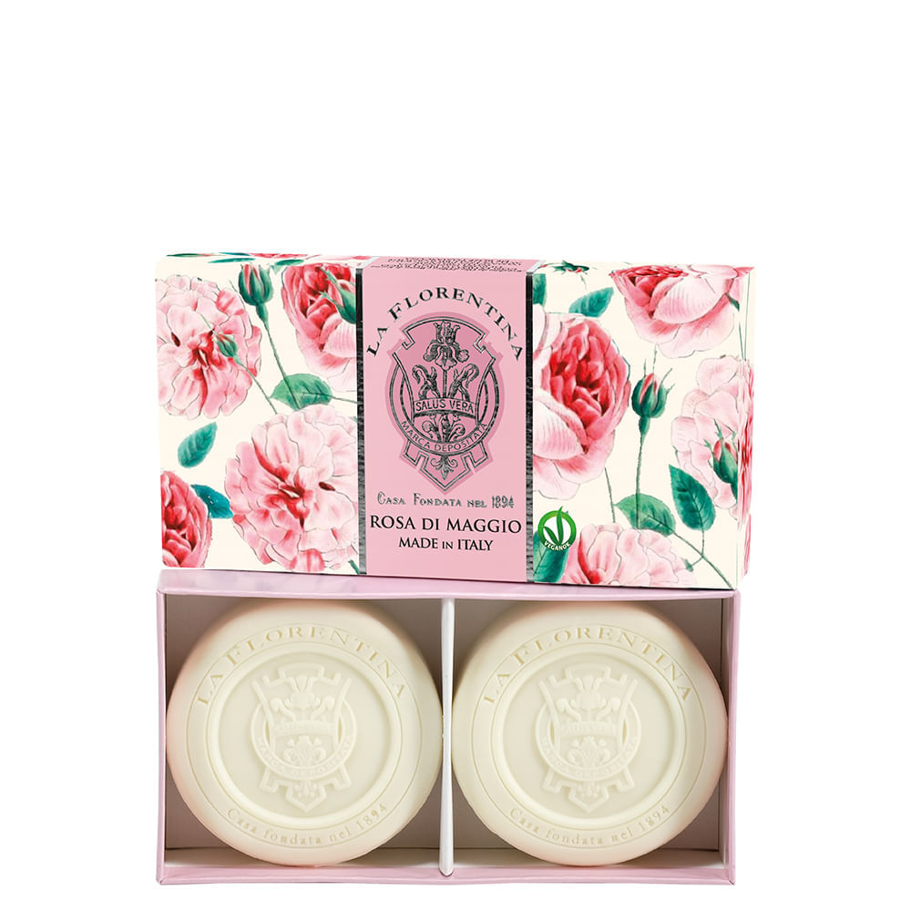 Kit com 2 sabonetes Rose of May 115g cada.<br /> Experimente a elegância italiana com o sabonete em barra Rose of May. Produzidos artesanalmente com óleos naturais e fragrâncias exclusivas. As embalagens, desenvolvidas por renomados artistas da Toscana, decoram seu banheiro com charme. Cada kit contém duas barras de sabonete em uma elegante caixa, ideal para presentear. A fragrância com rosa de maio promove uma limpeza revigorante. Sua espuma cremosa limpa, hidrata e deixa a pele macia. Vegano, sem corantes e parabenos. Fórmula enriquecida com azeite de oliva e extratos naturais.