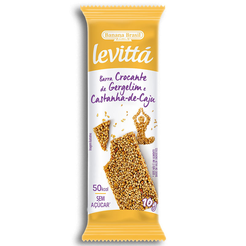 <p>A<strong> Levittá Sementes Gergelim e Castanha</strong>, da <strong>Banana Brasil</strong>, é uma barra crocante à base de gergelim e quinoa. Um alimento prático, com muitos benefícios, delicioso sabor e pouquíssimas calorias (<strong>apenas 50 kcal</strong>). É ideal para ser consumida a qualquer hora do dia, sendo uma excelente opção para incluir nutrientes essenciais na alimentação diária. </p> Sobre os ingredientes: <ul> <li> <strong>Gergelim:</strong> é composto por gorduras poli-insaturadas como o ômega 3 e ômega 6, ácidos graxos essenciais para o organismo. Também é uma boa fonte de vitaminas como: vitamina E, B1, B2 e B3. Também contém uma boa quantidade de minerais como cálcio, ferro, magnésio e fósforo. Ainda contém proteínas, possuindo um bom perfil de aminoácidos essenciais.</li> <li> <strong>Castanha-de-caju:</strong> possui gorduras do tipo monoinsaturada (ômega 9), é fonte de arginina, além de ser fonte de vitaminas e minerais como o magnésio e o selênio.</li> </ul> Alérgicos: <p>Contém castanha-de-caju. Pode conter amendoim.</p> Sugestão de consumo: <p>Ótima opção para consumo nas refeições intermediárias e em lanches rápidos.</p> Por que escolher este produto? <ul> <li>Sem glúten</li> <li>Sem açúcar</li> <li>50 calorias por barrinha</li> <li>Zero sódio</li> <li>Low carb</li> </ul> <strong>Sobre a marca:</strong> <p></p> <p>A Banana Brasil iniciou suas atividades em 1985, com a desidratação da banana. Ao longo do tempo, foi ampliando seu portfólio de produtos, e hoje em dia procura desenvolver opções de snacks saudáveis e nutritivos, sem adição de açúcar e sem glúten ou sódio. Os produtos são feitos a partir de ingredientes naturais que incluem frutas, sementes e castanhas.</p>