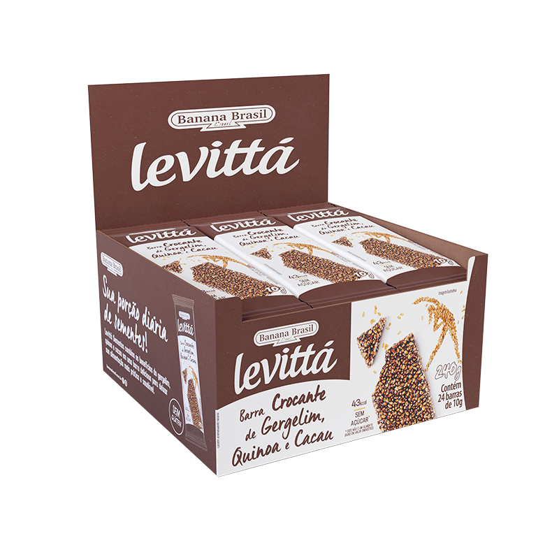 Informações técnicas do produto:<br /> A Barra Levittá Gergelim, Quinoa e Cacau, da Banana Brasil, é uma barrinha feita com sementes ideal para ser consumida nos lanches intermediários. É fonte de fibras e de gorduras do bem, possui baixo teor de carboidratos (low carb) e não contém glúten ou sódio.<br /> <br /> Recomendações de consumo:<br /> A Barra Levittá Gergelim, Quinoa e Cacau é gostosa e prática, sendo uma ótima opção para levar sempre com você e matar a fome no meio do dia!<br /> <br /> Por que escolher este produto:<br /> Prático<br /> Low carb<br /> Não contém glúten<br /> Zero sódio<br /> Fonte de fibras<br /> Sobre a marca:<br /> A Banana Brasil iniciou suas atividades em 1985, com a desidratação da banana. Ao longo do tempo, foi ampliando seu portfólio de produtos, e hoje em dia procura desenvolver opções de snacks saudáveis e nutritivos, sem adição de açúcar e sem glúten ou sódio. Os produtos são feitos a partir de ingredientes naturais que incluem frutas, sementes e castanhas.