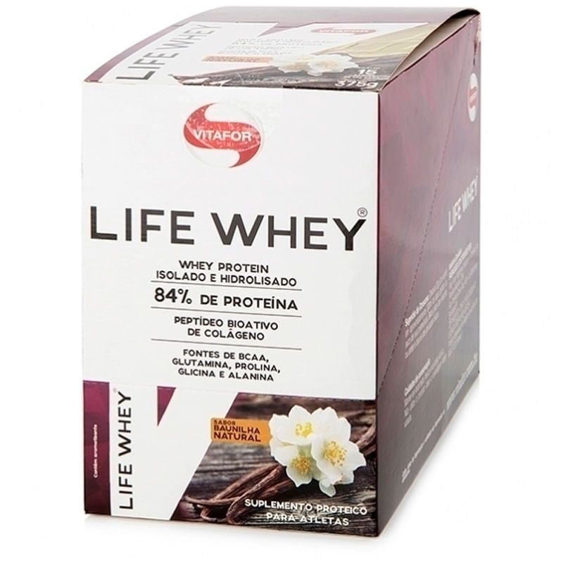 <p>"O Life Whey Baunilha, da Vitafor é um suplemento proteico elaborado com whey protein isolado e hidrolisado (proteínas de alto valor biológico) e peptídeo bioativo de colágeno Verisol®, sendo este melhor absorvido e utilizado pelo organismo. Além disso, é fonte de cálcio, vitamina C, Vitamina B3 e magnésio com aroma natural de baunilha.</p> <p> </p> <p>Recomendação de consumo:</p> <p> </p> <p>Dissolva 25g (1 sachê) em aproximadamente 300ml de água gelada ou suco de sua preferência. Beba antes das refeições ou ates e depois das atividades físicas.</p> <p> </p> <p> </p> <p> </p> <p>Alergênicos:</p> <p> </p> <p>Contém derivados do leite, e pode conter traços de soja. </p> <p> </p> <p> </p> <p> </p> <p>Por que escolher este produto?</p> <p> </p> <p>Isento de açúcar e aromatizante</p> <p> </p> <p>Contém peptídeos bioativos de colágeno Verisol®</p> <p> </p> <p>Com whey isolado e whey hidrolisado</p> <p> </p> <p>Adoçado com stevia e taumatina</p> <p> </p> <p>Com vitaminas</p> <p> </p> <p>Sobre a marca:</p> <p> </p> <p>A Vitafor é uma marca brasileira de suplementos alimentares com padrão de alta qualidade e eficácia, que valoriza o desenvolvimento sustentável, incorporando esse conceito a suas operações diárias. A marca possui certificação internacional de qualidade e de origem dos óleos de peixe utilizados em seus produtos, e possui rigorosa análise e comprovação de testes de todos os lotes de seus produtos."</p> <p> </p>