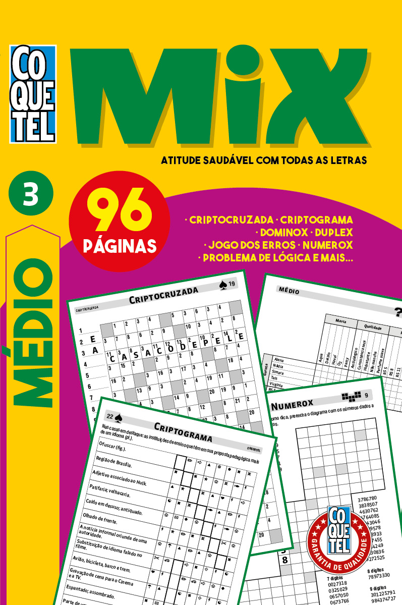 Em Coquetel Mix 3, você encontra  80 passatempos variados reunidos em um único livro. Garantia de diversão e conhecimento a qualquer hora e em qualquer lugar!Os passatempos dos livros Coquetel oferecem uma série de benefícios para a saúde mental, emocional e até mesmo para o desenvolvimento de habilidades cognitivas e linguísticas. ?? Benefícios para a saúde Estímulo cognitivo Exercitam o cérebro de forma lúdica, mantendo funções cognitivas ativas, como memória, atenção, raciocínio lógico e velocidade de processamento. Podem retardar o declínio cognitivo relacionado à idade e reduzir o risco de doenças neurodegenerativas, como Alzheimer e demência. Redução do estresse Ao focar na resolução dos desafios, o cérebro entra em um estado de concentração que pode funcionar como uma forma de meditação ativa, diminuindo o estresse e a ansiedade. Melhora do humor Resolver um desafio corretamente gera sensação de recompensa e satisfação, promovendo a liberação de dopamina (neurotransmissor associado ao prazer e à motivação). Desenvolvimento da paciência e da persistência A prática constante ensina a lidar com erros, persistir até encontrar uma solução e manter o foco por períodos mais longos. Apoio à saúde mental na terceira idade São aliados importantes no envelhecimento saudável, ajudando a manter a autonomia e o engajamento intelectual. ?? Benefícios para o conhecimento Ampliação do vocabulário As palavras-cruzadas e caça-palavras, especialmente, estimulam o reconhecimento de palavras novas, sinônimos, regionalismos e termos técnicos ou culturais. Aprimoramento da ortografia e da gramática A prática frequente melhora a memória ortográfica e favorece a fixação de grafias corretas e regras gramaticais. Desenvolvimento do raciocínio lógico e matemático Jogos como sudoku treinam a lógica, o pensamento dedutivo e a capacidade de prever cenários, competências úteis em diversas áreas do conhecimento. Incentivo à curiosidade e à aprendizagem contínua Ao deparar-se com palavras ou temas desconhecidos, o jogador pode buscar o significado ou contexto, promovendo aprendizado autônomo. Fortalecimento da memória semântica e de longo prazo A associação de pistas e palavras contribui para reforçar conhecimentos já adquiridos e melhorar a recuperação de informações armazenadas. ?? Bônus: benefícios sociais Resolver passatempos em grupo (com amigos, familiares ou em clubes) estimula interações sociais saudáveis, o que também está ligado a um menor risco de depressão e isolamento, especialmente em idosos.