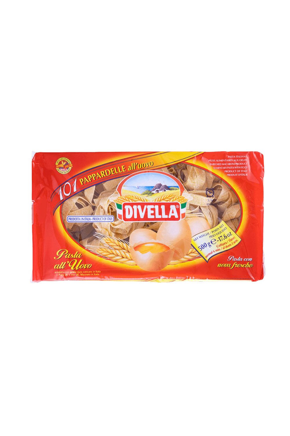 VOCÊ ESTÁ COMPRANDO: MACARRÃO DIVELLA 101 PAPPARDELLE ALL' UOVO 500G<br /> PAIS DE ORIGEM: ITÁLIA<br /> <br /> SOBRE O PRODUTO:<br /> <br /> O Pappardelle é uma massa longa, larga e plana. As massas Divella feitas com ovos frescos garantem leveza e aroma, sem perder o ponto al dente. "Nidi" em português significa "ninho", nome dado a essa linha da Divella devido ao seu formato. As massas Divella são feitas exclusivamente de grano duro 100% italiano, que trazem derivados do trigo com mais proteínas.<br /> <br /> A Divella desde 1890 é produtora de massa exclusivamente feita de Grano Duro e fabricada 100% na Itália. Sua inspiração continua a mesma desde seu início: passar a tradição da Puglia e da dieta mediterrânea por meio da autêntica massa italiana. Seus pilares podem ser resumidos em alguns pontos: Excelência na qualidade, atenção à saúde e segurança do consumidor, respeito ao meio ambiente e responsabilidade social.