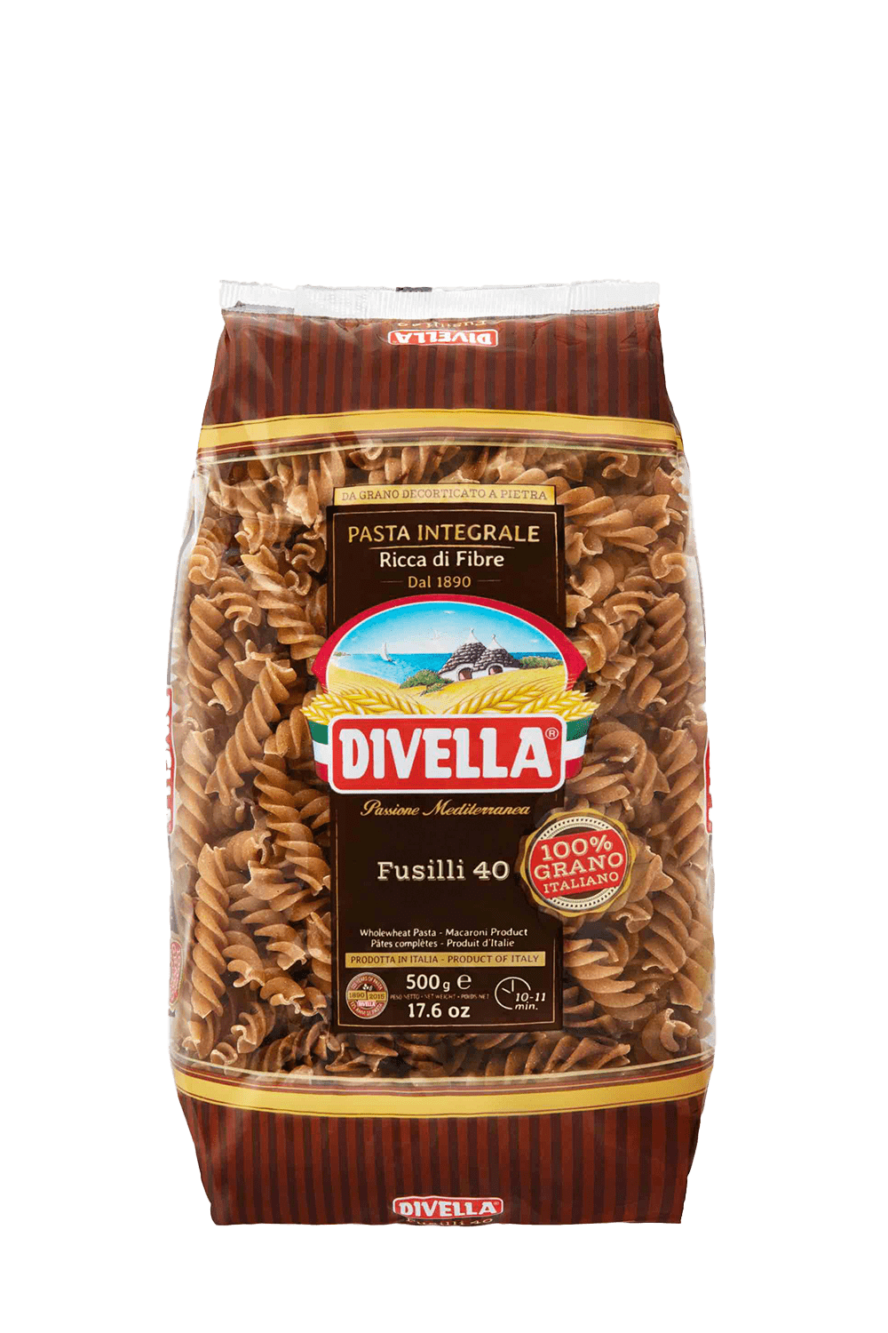 VOCÊ ESTÁ COMPRANDO: MACARRÃO DIVELLA 40 FUSILLI INTEGRAL 500G<br /> PAIS DE ORIGEM: ITÁLIA<br /> <br /> SOBRE O PRODUTO:<br /> <br /> O famoso fusilli, massa com formato semelhante a um parafuso, é ideal para ser servido com molhos mais encorpados ou a base de queijo. Também pode ser preparado em pratos frios e saladas. A linha integral é rica em fibras, ajuda na digestão e aumenta a sensação de saciedade. As massas Divella são feitas exclusivamente de grano duro 100% italiano, que trazem derivados do trigo com mais proteínas.<br /> <br /> A Divella desde 1890 é produtora de massa exclusivamente feita de Grano Duro e fabricada 100% na Itália. Sua inspiração continua a mesma desde seu início: passar a tradição da Puglia e da dieta mediterrânea por meio da autêntica massa italiana. Seus pilares podem ser resumidos em alguns pontos: Excelência na qualidade, atenção à saúde e segurança do consumidor, respeito ao meio ambiente e responsabilidade social.