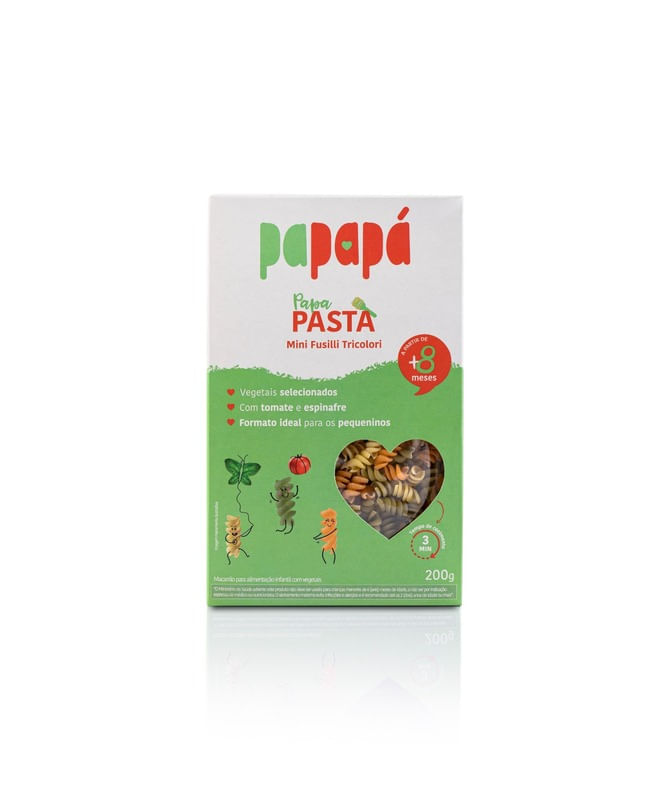 <p>A <strong>Papa Pasta Mini Fusilli Tricolori da Papapá</strong> é uma massa elaborada no formato ideal para a criançada, ela é feita com vegetais selecionados, sem adição de sal e livre de conservantes, e o melhor: fica pronta em apenas 3 minutinhos. </p> <h2><strong>Sugestão de consumo:</strong></h2> <p>Indicado para bebês a partir de 8 meses de idade, não havendo restrições para crianças maiores.</p> <h2><strong>Motivos para escolher o produto:</strong></h2> <ul> <li> <p>Livre de conservantes, corantes e aditivos químicos;</p> </li> <li> <p>Sem adição de sal;</p> </li> <li> <p>Clean label; </p> </li> <li> <p>Fica pronto em 3 minutos.</p> </li> </ul> <h2><strong>A Marca</strong></h2> <p>A Papapá é uma marca comprometida em oferecer opções práticas, saudáveis, naturais, usando orgânicos sempre que possível, promovendo uma introdução alimentar natural para o bebê e tranquila para você! </p> <p> </p>