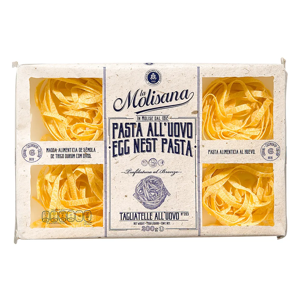 VOCÊ ESTÁ COMPRANDO: MASSA LA MOLISANA 203 TAGLIATELLE ALL'UOVO<br /> PAIS DE ORIGEM: ITÁLIA<br /> <br /> SOBRE O PRODUTO:<br /> <br /> O Macarrão Tagliatelle da La Molisana é uma massa com alto teor de proteína, garante tenacidade e durabilidade. São deliciosos cestos de massa de semolina, que acolhem todo tipo de tempero e molhos.<br /> <br /> Importada da Itália, possui formato alongado, com espessura mediana. Elaborada com sêmola de trigo duro, sua receita leva ovos. Após preparada, possui textura delicada e sabor suave, podendo ser combinada com diferentes molhos e acompanhamentos.<br /> <br /> Sua porção de 80 gramas (1 prato raso) possui valor energético de 290 kcal, 53 gramas de carboidratos, 12 gramas de proteínas e 3,2 miligramas de sódio.
