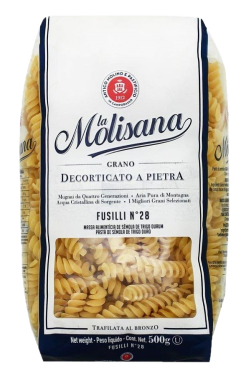 VOCÊ ESTÁ COMPRANDO: MACARRÃO LA MOLISANA 28 FUSILLI 500G<br /> PAIS DE ORIGEM: ITÁLIA<br /> <br /> SOBRE O PRODUTO:<br /> <br /> Massa fusilli La Molisana. Um formato clássico, feito com trigo 100% italiano. Rico em proteínas, excelente elasticidade e com alta resistência na cocção, é uma ótima opção para molhos encorpados, saladas e caldos.<br /> <br /> • tempo de cozimento: 10 minutos<br /> <br /> INGREDIENTES sêmola de trigo. Contém glúten<br /> <br /> ALÉRGICOS<br /> <br /> • Pode conter soja<br /> <br /> <br /> <br /> INFORMAÇÕES DIETÉTICAS<br /> <br /> VEGANO • VEGETARIANO<br /> <br /> FORMATO pacote<br /> <br /> VOLUME 500g