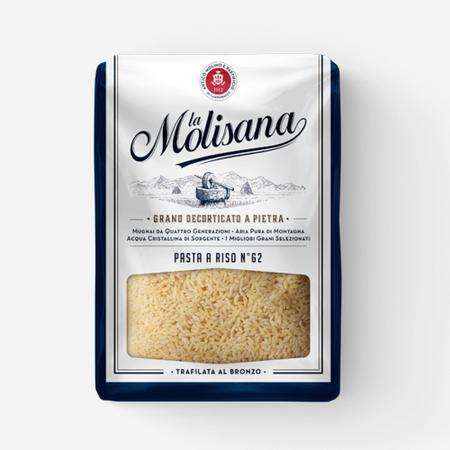 VOCÊ ESTÁ COMPRANDO: MASSA LA MOLISANA 62 PASTA A RISO 500G<br /> PAIS DE ORIGEM: ITÁLIA<br /> <br /> Massa com grãos pequenos e dourados semelhantes ao grão de arroz. Sua superfície levemente rugosa adere melhor a molhos e temperos. O formato é ideal para o preparo de risotos, sopas e caldos.<br /> <br /> • tempo de cozimento: 9 minutos<br /> <br /> <br /> INGREDIENTES sêmola de trigo. Contém glúten<br /> <br /> ALÉRGICOS<br /> <br /> • Pode conter soja<br /> <br /> <br /> INFORMAÇÕES DIETÉTICAS<br /> <br /> VEGANO • VEGETARIANO<br /> <br /> <br /> FORMATO pacote<br /> <br /> VOLUME 500g