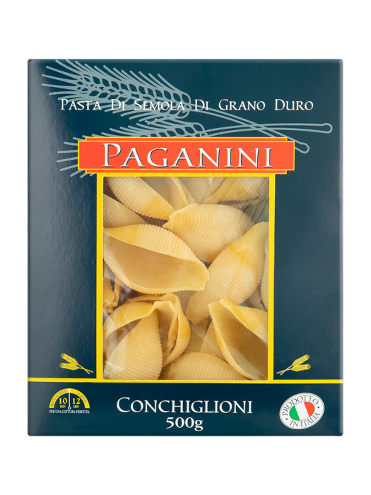 Massa elaborada com sêmola de grano duro em forma de conchas. Normalmente é recheada com molhos de queijo, frutos do mar ou agridoces.<br /> <br /> Paganini<br /> Nosso slogan é Specialitá Gastronômica, mas a verdadeira specialitá da Paganini é aquela inerente à culinária italiana e que a faz ser a mais bem aceita em todas as partes do globo: a capacidade de absorver sabores e ingredientes de outros países se tornando ainda mais deliciosa do que já é. Nossos produtos possuem apelo universal. Detêm o poder de aglutinar culturas, reunir famílias, celebrar acontecimentos importantes. E todo chef, dona de casa ou apreciador da boa mesa é capaz de aprimorar nossos produtos dando seu próprio toque pessoal e artístico. Mais do que se adaptar a incontáveis culturas, as massas Paganini se incrementam e tomam características peculiares e únicas em cada cozinha na qual adentram. Somos praticamente uma tela esperando pelas cores gustativas de cada chef, seja ele profissional ou amador, gênio ou aventureiro, gourmet ou leigo na arte da gastronomia. Produtos 100% fabricados na Itália, com alto padrão de qualidade, com portfólio de: massas, molhos e atomatados, antepastos, arroz, azeites, alcachofras, tomate seco e cereja entre outros, garantindo ótimas receitas.<br /> <br /> Validade: 17/05/2024