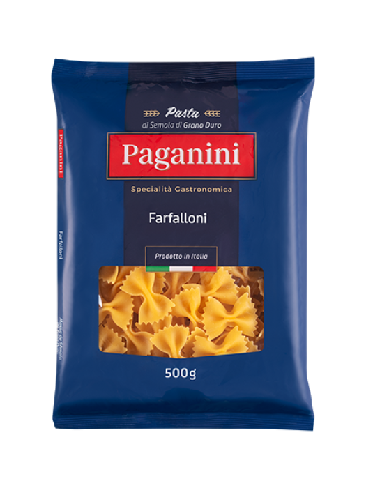 Massa elaborada com sêmola de grano duro, em formato de gravata borboleta, excelente para saladas, molhos leves e delicados. Um dos cortes mais tradicionais da Itália.<br /> Paganini<br /> Nosso slogan é Specialitá Gastronômica, mas a verdadeira specialitá da Paganini é aquela inerente à culinária italiana e que a faz ser a mais bem aceita em todas as partes do globo: a capacidade de absorver sabores e ingredientes de outros países se tornando ainda mais deliciosa do que já é. Nossos produtos possuem apelo universal. Detêm o poder de aglutinar culturas, reunir famílias, celebrar acontecimentos importantes. E todo chef, dona de casa ou apreciador da boa mesa é capaz de aprimorar nossos produtos dando seu próprio toque pessoal e artístico. Mais do que se adaptar a incontáveis culturas, as massas Paganini se incrementam e tomam características peculiares e únicas em cada cozinha na qual adentram. Somos praticamente uma tela esperando pelas cores gustativas de cada chef, seja ele profissional ou amador, gênio ou aventureiro, gourmet ou leigo na arte da gastronomia. Produtos 100% fabricados na Itália, com alto padrão de qualidade, com portfólio de: massas, molhos e atomatados, antepastos, arroz, azeites, alcachofras, tomate seco e cereja entre outros, garantindo ótimas receitas.<br /> <br /> Validade: 30/11/2023