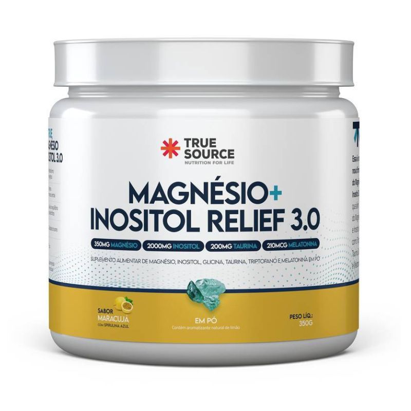 <p>O <strong>Magnésio + Inositol Relief 3.0 da True Source</strong> é elaborado com um blend de nutrientes que contribuem para o relaxamento e melhora da qualidade do sono, possui magnésio bisglicinato, inositol, maracujá em pó e melatonina. Ideal para incluir na sua rotina noturna, basta beber uma dose antes de dormir e relaxar.</p> <h2>Sobre os ingredientes:</h2> <p><strong>Melatonina:</strong> é um hormônio produzido pelo organismo, conhecido como o "hormônio do sono". Esse hormônio ajuda a regular o sono e participa da reparação das células, expostas a estresse, poluição e outros elementos nocivos.</p> <p><strong>Magnésio Inositol:</strong> atua no sistema nervoso central promovendo relaxamento físico e mental, melhora da qualidade do sono e saúde intestinal.</p> <p><strong>Magnésio bisglicinato:</strong> forma mais biodisponível do magnésio, está ligado a um ou mais aminoácidos.</p> <h2>Sugestão de consumo:</h2> <p>Diluir 1 medidor (7g) em água, e consumir a noite antes de dormir, ou conforme prescrição do nutricionista. </p> <h2>Motivos para escolher o produto:</h2> <ul> <li> <p>Livre de glúten e lactose;</p> </li> <li> <p>Sem corantes e adoçantes artificias;</p> </li> <li> <p>Adoçado naturalmente com Stévia;</p> </li> </ul> <h2>A Marca</h2> <p>A <strong>True Source</strong> é uma empresa movida pelo bem-estar, rendimento físico e pela natureza. Os produtos da True Source são elaborados com matéria-prima importada, ingredientes extraídos da natureza, proteínas limpas e sem aditivos, com isso a marca traz uma suplementação perfeita para sua dieta, com produtos de qualidade e sabor excelente. </p>