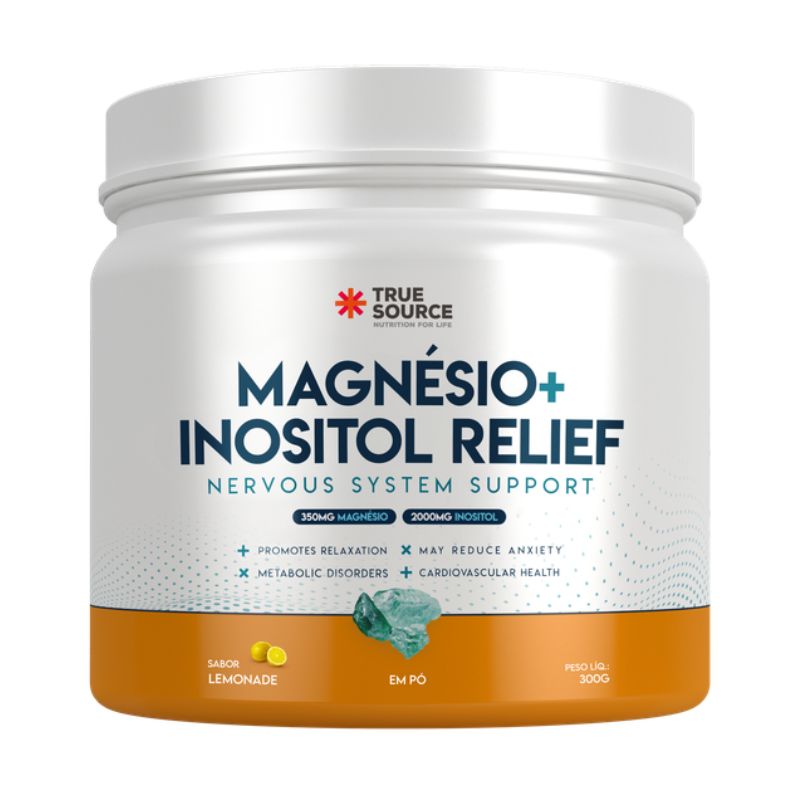 <p>O <strong>Magnésio + Inositol Relief</strong> sabor limão, da <strong>True Source</strong>, possui uma fórmula clean, livre de glúten, lactose e corantes artificiais. É elaborado com 350mg de magnésio bisglicinato e 2g de Inositol, micronutrientes que atuam em mais de 300 ações metabólicas do organismo. </p> <h2>Sobre os ingredientes:</h2> <p><strong>Inositol: </strong>atua no sistema nervoso central promovendo relaxamento físico e mental, melhora da qualidade do sono e saúde intestinal.</p> <p><strong>Magnésio bisglicinato:</strong> forma mais biodisponível do magnésio, está ligado a um ou mais aminoácidos.</p> <h2>Sugestão de consumo:</h2> <p>Diluir 1 medidor em água, pela manhã ou ao final do dia, ou conforme prescrição do nutricionista. </p> <h2>Motivos para escolher o produto:</h2> <ul> <li> <p>Livre de glúten e lactose;</p> </li> <li> <p>Sem corantes e adoçantes artificias;</p> </li> <li> <p>Zero açúcar;</p> </li> <li> <p>Clean-label;</p> </li> <li> <p>Adoçado naturalmente com Stévia;</p> </li> </ul> <h2>A Marca:</h2> <p>A <strong>True Source</strong> é uma empresa movida pelo bem-estar, rendimento físico e pela natureza. Os produtos da True Source são elaborados com matéria-prima importada, ingredientes extraídos da natureza, proteínas limpas e sem aditivos, com isso a marca traz uma suplementação perfeita para sua dieta, com produtos de qualidade e sabor excelente. </p>