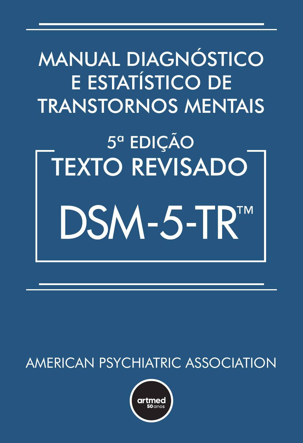 O  Manual diagnóstico e estatístico de transtornos mentais, 5ª edição, texto revisado (DSM-5-TR), é recurso imprescindível para o diagnóstico e a classificação de transtornos mentais, seja na prática clínica, seja na pesquisa na área de saúde mental.Com contribuições de mais de 200 especialistas e baseado na literatura científica mais recente, o DSM-5-TR traz os códigos da CID-10-MC implementados desde 2013 e apresenta um novo transtorno na Seção II – o transtorno do luto prolongado.  Além disso, os textos de todos os transtornos foram amplamente revisados, incluindo as seções sobre características associadas, desenvolvimento e curso, fatores de risco e prognóstico, questões diagnósticas relativas à cultura, questões diagnósticas relativas ao sexo e ao gênero, marcadores diagnósticos, associação com pensamentos e comportamentos suicidas, diagnóstico diferencial e muito mais.Este manual é recurso fundamental para psiquiatras e demais profissionais da saúde, incluindo psicólogos, enfermeiros, terapeutas ocupacionais, bem como assistentes sociais e especialistas forenses e legais.