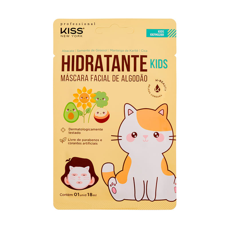 <p>A <strong>Máscara Facial para Crianças Hidratante Kiss New York 18ml </strong>contém ingredientes seguros, é ideal para a pele sensível dos pequenos.</p> <p>A Máscara Facial Kiss New York Hidratante é a versão da amada máscara de algodão, agora na versão kids! A máscara vem mais divertida do que nunca e mas em um tamanho menor, perfeita para rostos pequenos. Feita a partir de algodão, natural e biodegradável, conta com formulação Clean Beauty, com ingredientes seguros, não tóxicos e completamente livres de químicos irritantes à pele. Também possui o selo K-Beauty, garantindo, assim, maior transparência e originalidade. Indicado para crianças a partir dos 4 anos de idade.</p> Sugestão de uso: <p>Com a pele limpa, aplique a máscara no rosto e deixe agir durante 15 minutos Retire a máscara e massageie o sérum remanescente até sua absorção completa.</p> Sobre os ingredientes: <p>Abacate, semente de girassol, manteiga de karité, centella asiática, pantenol (Vitamina B5) e hamamelis.</p> Motivos para escolher o produto: <ul> <li> <p>Possui excelente efeito hidratante.</p> </li> <li> <p>Contém proteínas que contribuem para uma pele saudável.</p> </li> <li> <p>Fortalece a barreira de proteção da pele</p> </li> <li> <p>Ajuda a acalmar a pele</p> </li> <li> <p>Mantém a vitalidade</p> </li> </ul> Sobre a marca: <p> <strong>Kiss New York</strong>, desde 1988, oferece produtos de qualidade diretamente ao consumidor final por meio de itens fáceis de usar e que promovem resultados de salão. De início, seu foco era desenvolver fórmulas para uma manicure profissional em casa. Porém, seu portfólio cresceu expressivamente, ao ponto de se tornar referência mundial em maquiagem.</p>