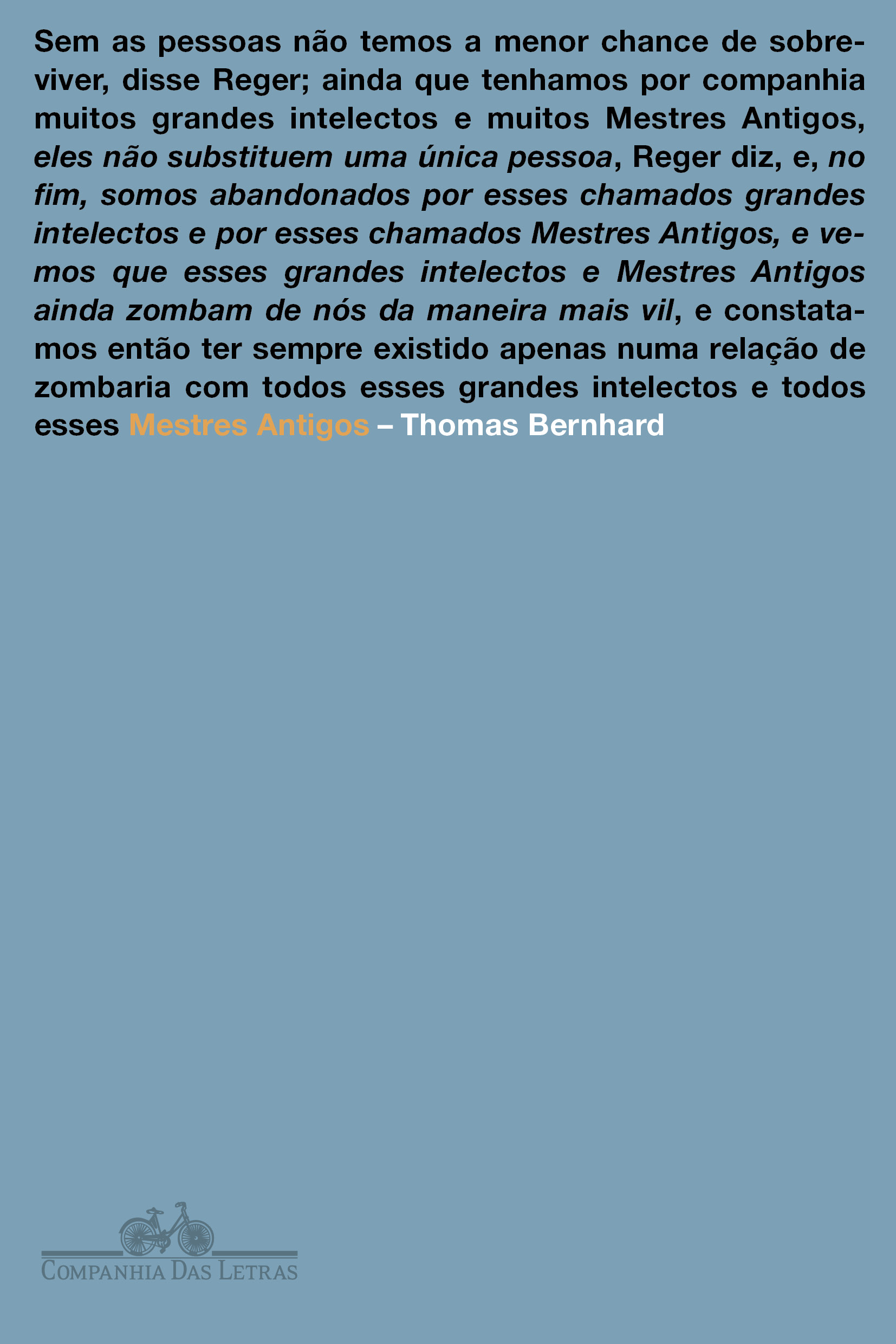 Bernhard faz um retrato cômico e implacável do meio artístico e da cultura austríaca por meio das conversas entre dois velhos amigos diante de uma pintura de Tintoretto.Por mais de trinta anos, Reger, um crítico musical octogenário, sentou-se no mesmo banco diante da pintura Homem de barba branca, de Tintoretto, no Museu de História da Arte de Viena. Ali ele reflete, dia sim, dia não, sobre a sociedade contemporânea, seus pares, a arte e os artistas, o clima e até o estado dos banheiros públicos.O amigo Atzbacher, um filósofo bem mais jovem, é convocado a encontrá-lo no museu num sábado, dia sempre evitado pelo crítico. E é através do seu olhar que passamos a conhecer mais sobre Reger — a morte trágica de sua mulher, seus temidos pensamentos suicidas, a relação difícil com seu país e, por fim, qual o verdadeiro propósito daquele encontro.Tão pessimista como exuberante, rancoroso e ao mesmo tempo hilário — no melhor estilo de Thomas Bernhard —, o romance é composto de um único parágrafo que se estende por 182 páginas e remonta uma série de conversas entre os dois amigos.  Mestres A  ntigos foi publicado originalmente em 1985 e é um retrato satírico da cultura e da nação austríaca, discutindo questões como genialidade, classe e as aspirações da humanidade.“O romance mais saboroso de Bernhard.” — Robert Craft, New York Review of Books“Bernhard é um dos mestres da ficção europeia contemporânea.” — George Steiner