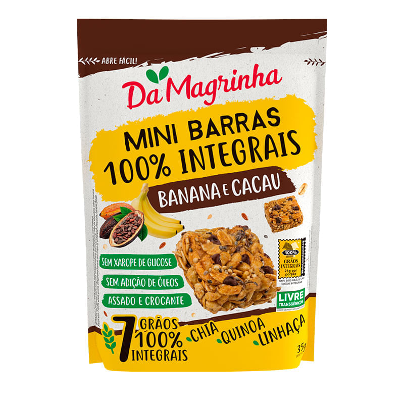 <p>As Mini Barras 100% Integrais sabor Banana e Cacau, da Da Magrinha, 35 g, são deliciosos snacks feitos com 7 grãos 100% integrais. Opção perfeita para aqueles que buscam uma alimentação saudável e não abrem mão da praticidade.</p> <p> </p> <p>Sobre os ingredientes:</p> <p>Banana: rica em fibras, potássio, vitaminas C e vitaminas B1, B2, B6, além dos minerais como magnésio, cobre, manganês, cálcio, ferro e ácido fólico.</p> <p>Cacau: rico em flavonoides, fonte de potássio, cobre, cálcio, magnésio e ferro.</p> <p>Aveia: rica em proteínas, ferro, magnésio, fósforo, zinco, manganês, vitamina B1 e vitamina B5, além de ser excelente fonte de fibras solúveis.</p> <p>Açúcar Mascavo: diferente do açúcar branco, o açúcar mascavo não passa pelo processo de refinamento, o que mantém as vitaminas e os sais minerais da cana-de-açúcar.</p> <p>Recomendação de consumo:</p> <p> </p> <p>Ideais para serem consumidas nas refeições intermediárias e para lanches rápidos.</p> <p> </p> <p>Por que escolher este produto?</p> <p>100% integral</p> <p>7 grãos</p> <p>Zero gorduras trans</p> <p>Sem adição de óleo</p> <p>Baixo teor de sódio</p> <p> </p> <p>Sobre a marca:</p> <p> </p> <p>A Da Magrinha é a 1ª marca do Brasil com tudo 100% integral. Tudo 100% assado, com Certificado Internacional Whole Grain, livre de transgênicos, 7 grãos nobres, embalagens em stand up pouch com zíper que abre e fecha, e com 40% de redução de plásticos. Produtos artesanais, saudáveis, gostosos e integral de verdade!</p>