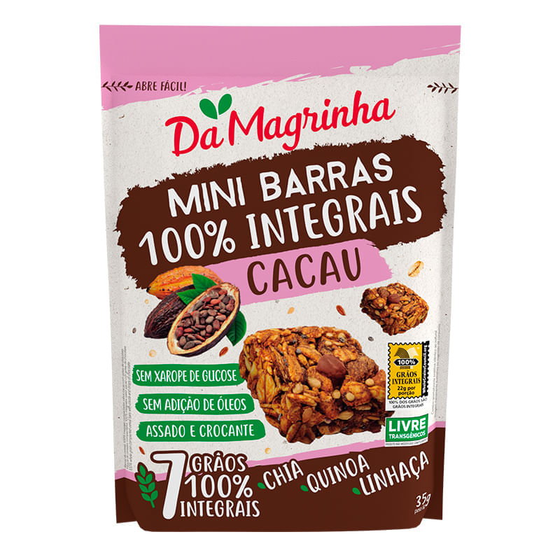 <p>As Mini Barras 100% Integrais sabor Cacau, da Da Magrinha, 35 g, são deliciosos snacks feitos com 7 grãos 100% integrais. Opção perfeita para aqueles que buscam uma alimentação saudável e não abrem mão da praticidade.</p> <p> </p> <p>Sobre os ingredientes:</p> <p>Cacau: rico em flavonoides, fonte de potássio, cobre, cálcio, magnésio e ferro.</p> <p>Aveia: rica em proteínas, ferro, magnésio, fósforo, zinco, manganês, vitamina B1 e vitamina B5, além de ser excelente fonte de fibras solúveis</p> <p>Açúcar Mascavo: diferente do açúcar de mesa, o açúcar mascavo não passa pelo processo de refinamento, o que mantém as vitaminas e os sais minerais da cana-de-açúcar.</p> <p>Recomendação de consumo:</p> <p> </p> <p>Ideais para serem consumidos nas refeições intermediárias e para lanches rápidos.</p> <p> </p> <p>Por que escolher este produto?</p> <p>100% integral</p> <p>7 grãos</p> <p>Zero gorduras trans</p> <p>Sem adição de óleo</p> <p>Baixo teor de sódio</p> <p>Sobre a marca:</p> <p> </p> <p>A Da Magrinha é a 1ª marca do Brasil com tudo 100% integral. Tudo 100% assado, com Certificado Internacional Whole Grain, livre de transgênicos, 7 grãos nobres, embalagens em stand up pouch com zíper que abre e fecha, e com 40% de redução de plásticos. Produtos artesanais, saudáveis, gostosos e integral de verdade!</p>