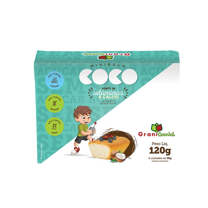 <h2 style="text-align: justify;"><strong>Mini Bolo</strong> <strong>Coco Grani Amici 120g</strong></h2> <h2 style="text-align: justify;">O <strong>Mini bolo </strong>sabor<strong> coco Grani Amici</strong>, é elaborado com farinha de arroz e coco ralado, não contém glúten, é sem adição de leite e açúcar. É enriquecido com cálcio e vitaminas do complexo B e D3 e possui uma textura bem leve e saborosa. Muito prático para o dia a dia.</h2> <h2 style="text-align: justify;"><strong>Sobre os ingredientes:</strong></h2> <h2 style="text-align: justify;"><strong>Alérgicos</strong>: contém ovos e derivados de soja<br /><strong>Pode conter:</strong> amêndoas e castanha do caju.</h2> <h2 style="text-align: justify;"><strong>Sugestão de consumo:</strong></h2> <h2 style="text-align: justify;"><span style="">Ideal para consumir em lanches intermediários. Tenha sempre na bolsa ou na mochila uma opção saudável e de fácil transporte. Para lanches escolares, trabalho, academia, faculdade, ou em qualquer outro lugar. </span><strong> </strong></h2> <h2 style="text-align: justify;"><strong>Motivos para escolher o produto:</strong></h2> <h2 style="text-align: justify;">● Produto sem glúten; </h2> <h2 style="text-align: justify;">● Sem lactose;</h2> <h2 style="text-align: justify;">● Sem leite (APLV);</h2> <h2 style="text-align: justify;">● Enriquecidos com cálcio, vitaminas do complexo B e D3</h2> <h2 style="text-align: justify;">● Adoçado com adoçante natural</h2> <h2 style="text-align: justify;">● Caixinha com 3 unidades individuais de 40g </h2> <h2 style="text-align: justify;"> </h2> <h2 style="text-align: justify;"><strong>A Marca</strong></h2> <h2 style="text-align: justify;">Fundada em 2010, a Grani Amici tem o propósito de oferecer bem-estar e inclusão às pessoas com intolerâncias e alergias alimentares, através da fabricação dos melhores panificados livres de glúten, leite e lactose! Os alimentos Grani Amici são elaborados com a segurança que nossos consumidores merecem e precisam. Destinados a todos aqueles que querem viver livres de preocupações na hora de se alimentar!</h2>