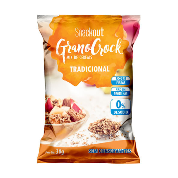 Informações técnicas do produto:<br> O Mix de Cereais Granocrock Tradicional, da Snackout, 30g, oferece um mix de ingredientes naturais fonte de fibras, 0% de sódio e 3,5g de proteínas na porção.<br> <br> Recomendação de uso:<br> Pode ser adicionado saladas de frutas, smoothies, açaí, vitaminas no preparo de outras receitas.<br> <br> Por que escolher esse produto?<br> 3,2g de fibras na porção<br> Rico em proteínas<br> 100% natural<br> Livre de conservantes ou adoçantes artificiais<br> Sobre a marca:<br> A Snackout é uma empresa fundada em 2015, com a ideia de proporcionar alimentos saudáveis e saborosos de verdade a partir de produtos diferenciados da marca. Com um time excelente pensando sempre na sintonia, confiança, garra e criatividade, convidam os clientes a seguir um estilo de vida mais saudável de maneira leve e prazerosa, proporcionando bem-estar e uma experiência incrivel.