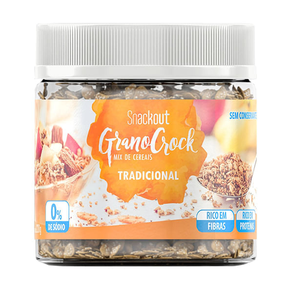 Informações técnicas do produto:<br> O Mix de Cereais Granocrock Tradicional, da Snackout, 220g, oferece um mix de ingredientes naturais fonte de fibras, 0% de sódio e 3,5g de proteínas na porção.<br> <br> Recomendação de uso:<br> Pode ser adicionado saladas de frutas, smoothies, açaí, vitaminas no preparo de outras receitas.<br> <br> Por que escolher esse produto?<br> 3,2g de fibras na porção<br> Rico em proteínas<br> 100% natural<br> Livre de conservantes ou adoçantes artificiais<br> Sobre a marca:<br> A Snackout é uma empresa fundada em 2015, com a ideia de proporcionar alimentos saudáveis e saborosos de verdade a partir de produtos diferenciados da marca. Com um time excelente pensando sempre na sintonia, confiança, garra e criatividade, convidam os clientes a seguir um estilo de vida mais saudável de maneira leve e prazerosa, proporcionando bem-estar e uma experiência incrivel.