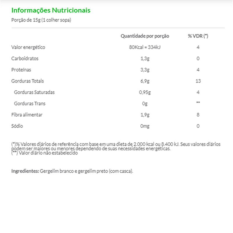 Informações técnicas do produto:<br> Mix Gergelim Integral Tostado, 100g, Sabor Alternativo é um alimento saboroso, sem adição de sal e açúcar, aromatizantes e corantes, feito com gergelim branco e gergelim preto com casca. O gergelim por ser integral é fonte de fibras, sais minerais (cálcio, ferro, zinco, selênio e magnésio) e vitaminas do complexo B.<br> <br> Recomendação de consumo:<br> Pode ser consumido com saladas, frutas, preparo de pães, bolos, ou como desejar.<br> <br> Informações sobre alergênicos:<br> Não contém Glúten.<br> <br> Por que escolher esse produto?:<br> Sem glúten<br> Não contém aromatizantes<br> Sem adição de açúcar<br> Sem adição de gordura<br> Sem conservantes