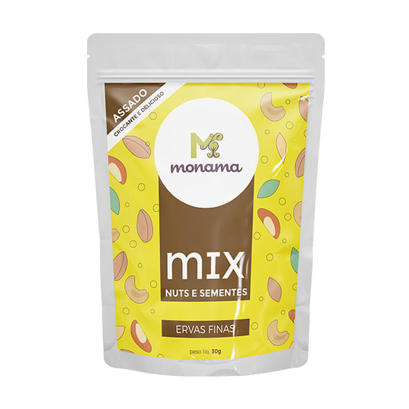 O Mix Nuts e Sementes, Ervas Finas, da Monama, 30g, é feito com amendoim, semente de girassol, amêndoas e castanha-de-caju, temperadas com azeite de oliva extra virgem, sal rosa e ervas finas. Assado no forno, delicioso e super nutritivo. Snack vegano ideal para saciar a fome nos lanchinhos ou acompanhando as refeições.