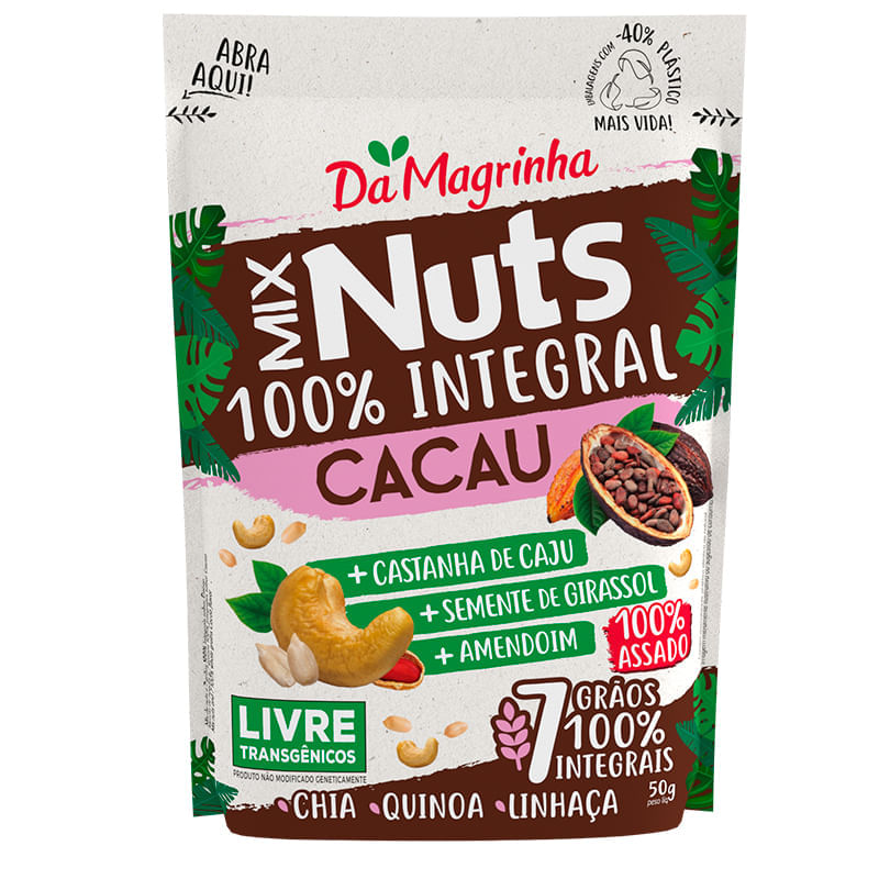 <p>São 100% integrais de verdade, feitos com 7 grãos, livre de transgênicos e ainda 100% assados. Garanta já o seu Mix de Nuts!</p> Sugestão de uso: <p>Pode ser consumido a qualquer hora do dia como alternativa de lanche.</p> Motivos para escolher o produto: <ul> <li> <p>100% assado</p> </li> <li> <p>Com 7 grãos 100% integrais</p> </li> <li> <p>Livre de transgênicos</p> </li> <li> <p>Sem glutamato</p> </li> </ul> Sobre a marca: <p>Fundada há mais de 25 anos em Florianópolis, <strong>Da Magrinha</strong> foi incorporada pelo grupo Hathor em 2012 com o objetivo de se tornar umas das marcas mais importantes do segmento no Brasil, criando produtos gostosos, artesanais, saudáveis e integrais de verdade!</p>