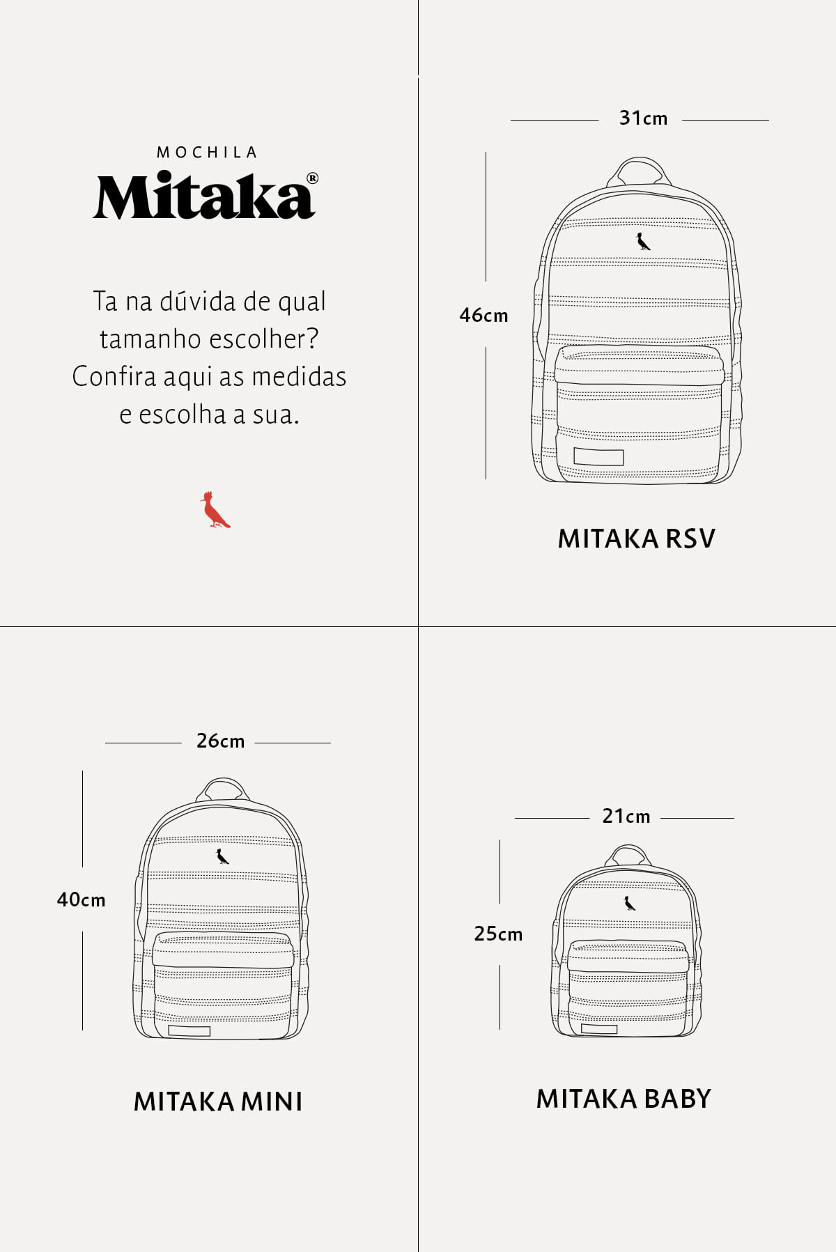 <br>A Mitaka Mini é feita para as novas gerações ou para quem gosta de uma versão compacta.</br> <br>O modelo é ideal para não ter que se preocupar em trocar de mochila a cada um ou dois anos, acompanhando a criança até seu crescimento.Esta mochila foi preparada para atender as necessidades de pais e filhos, para atividades escolares e extraclasse em uma única peça.Seu tamanho, maior que a Baby e menor que a RSV, se ajusta perfeitamente à altura da criança.</br> <br>Comprando esta peça, você viabiliza cinco pratos de comida através do nosso programa 1P5P.</br> <br>Medidas: Largura: 31 cm; Altura: 46 cm; Profundidade: 16 cm.Volume:22,8L; Compartimento para notebook: comporta notebooks de até 15 polegadas.</br>