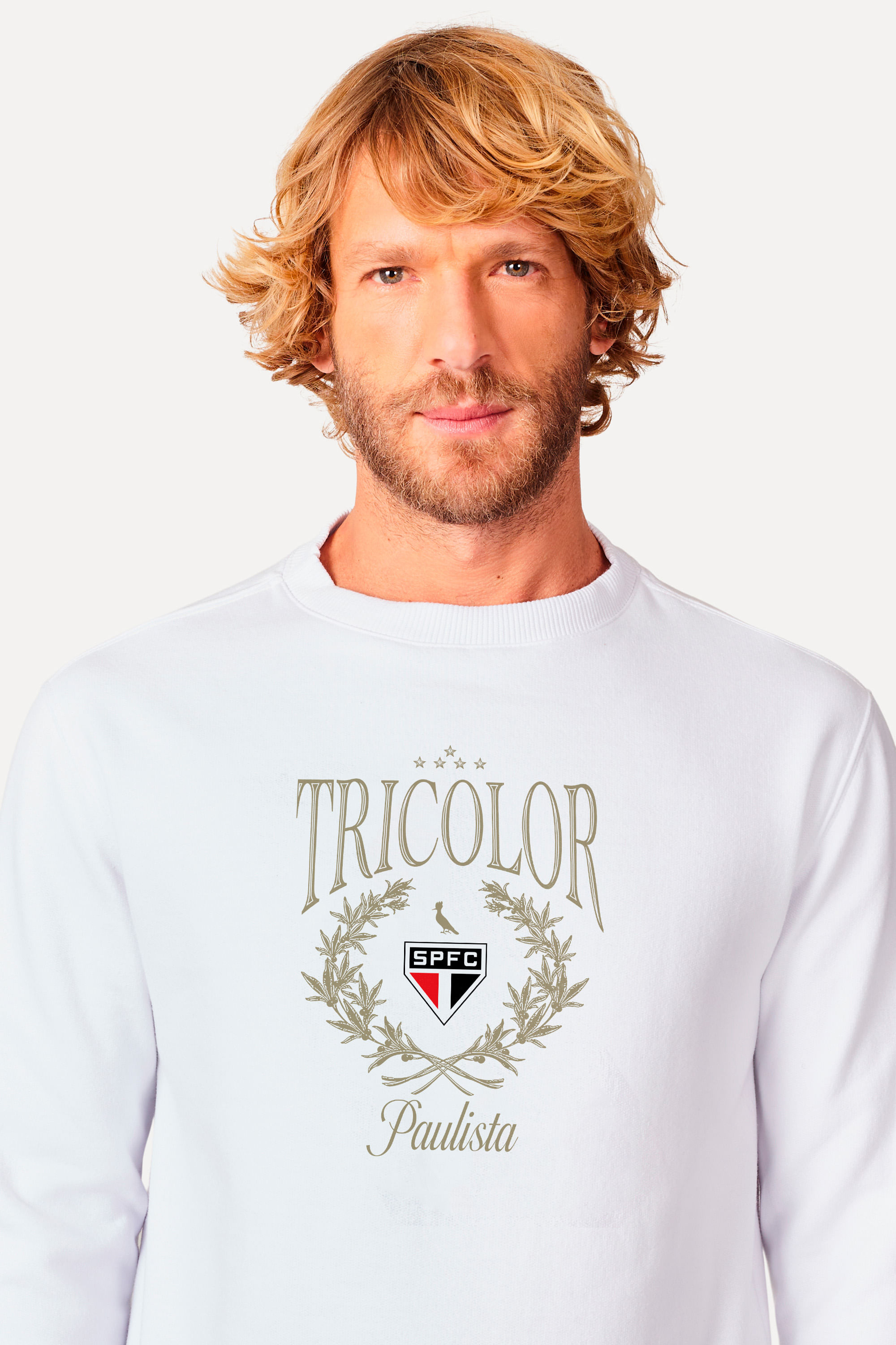 Moletom feito em algodão e poliéster de alta qualidade, garantindo muito conforto e frescor para torcer pelo Tricolor Paulista nos dias frios. Possui manga longa, gola redonda e estampa exclusiva Reserva + São Paulo Official Fashion Partner. Combine com calças e tênis. Comprando esta peça, você viabiliza cinco pratos de comida através do nosso Programa 1P5P. Casaco produzido eticamente no Brasil.