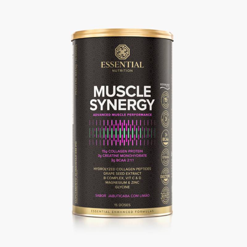 <p><span>O <strong>Muscle Synergy sabor jabuticaba com limão da Essential Nutrition</strong>, é um suplemento alimentar proteico e funcional. Sua fórmula é composta por colágeno BODYBALANCE®, creatina, BCAA, extrato de semente de uva, vitaminas e minerais, sendo uma alternativa proteica de alta performance.</span></p> <h2><b>Sobre os ingredientes:</b></h2> <p><b>Colágeno Bodybalance</b><b>®</b><b>: </b><span>colágeno hidrolisado em peptídeos de rápida digestão e absorção, com ação nas células musculares;</span></p> <p><b>Creatina:</b><span> aminoácido importante para o fornecimento de energia para as células musculares e neurológicas, atuando na força e desempenho físico e na ação dos neurônios;</span></p> <p><b>BCAA:</b><span> aminoácidos de cadeia ramificada que agem na produção de células musculares;</span></p> <p><b>Extrato de semente de uva:</b><span> fonte de proantocianidinas, substâncias antioxidantes que trabalham contra a ação de radicais livres.</span></p> <h2><b>Sugestão de consumo:</b></h2> <h2><span>Dilua 1 colher-medida (28,5g) em aproximadamente 200ml de água e consuma preferencialmente após a prática de atividade física ou conforme recomendação do nutricionista. </span><span><br /></span><span><br /></span><b>Motivos para escolher o produto:</b></h2> <ul> <li aria-level="1"><span>Blend de colágeno Bodybalance</span><b>®</b><span>, creatina e BCAA;</span></li> <li aria-level="1"><span>Contém 3g de creatina por dose; </span></li> <li aria-level="1"><span>Fonte de antioxidantes;</span></li> <li aria-level="1"><span>Fornece vitaminas e minerais essenciais; </span></li> <li aria-level="1"><span>Adoçado com adoçante natural stévia;</span></li> </ul> <h2><b>A Marca</b></h2> <p><span>A </span><b>Essential Nutrition </b><span>é uma marca especializada em nutrição funcional, produzindo produtos de extrema qualidade, utilizando as melhores matérias-primas e em suas concentrações ideias, excluindo o uso de ingredientes geneticamente modificados, glúten, lactose, corantes, conservantes e adoçantes artificiais.</span></p>