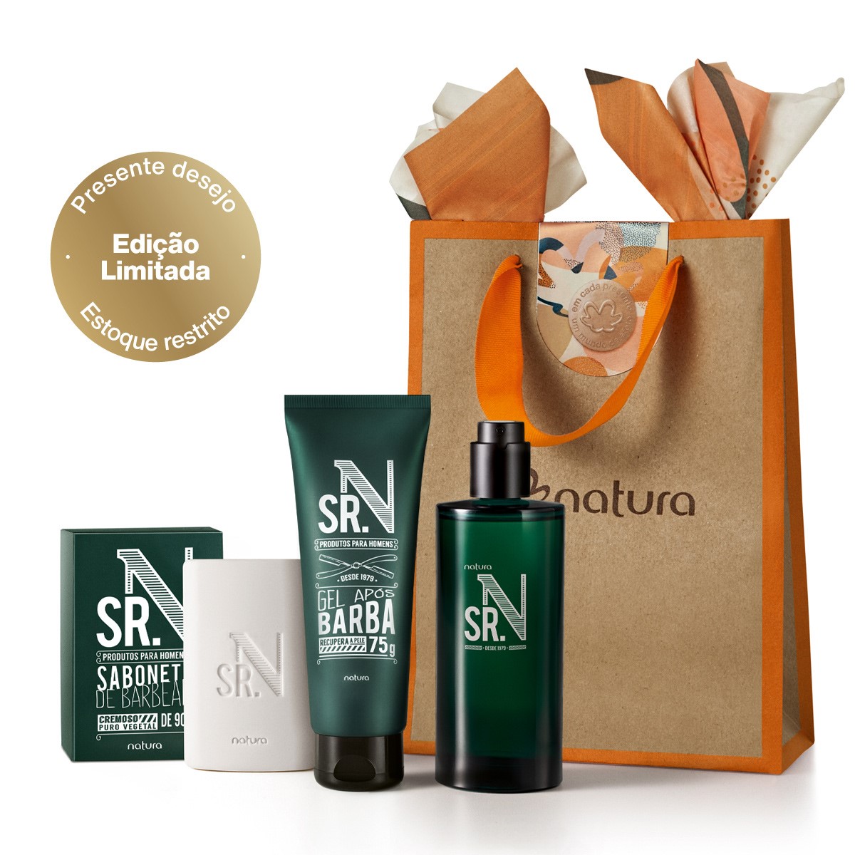 Presente com ritual de cuidados pessoais e perfumação na fragrância clássica de Sr. N.<br /> O Presente Natura Sr. N resgata o valor da tradição com uma linha clássica de cuidados pessoais e perfumes marcantes. Natura Sr. N foi a primeira marca masculina da Natura e, desde 1979, desenvolve soluções de alta qualidade, específicas para as necessidades do homem. Este presente é composto por um Sabonete em Barra Corpo e Barba Sr. N e um Gel Pós-barba Sr. N que ajuda a acalmar a pele e diminuir imitações. Para fechar, traz também o Desodorante Colônia Sr. N com fragrância cítrica moderada. Acompanha sacola especial de presente.<br /> <br /> <br /> <br /> Conteúdo:<br /> <br /> 1 Sabonete em barra cremoso corpo e barba 90 g.<br /> <br /> 1 Gel pós-barba 75 g.<br /> <br /> 1 Desodorante colônia masculino 100 ml.<br /> <br /> 1 Sacola especial de presente PP.